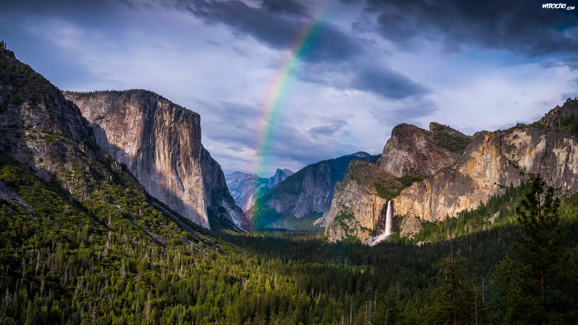 Zdjęcia, Stany Zjednoczone, Kalifornia, Park Narodowy Yosemite, Góry, Dolina, Chmury, Tęcza, Drzewa, Lasy