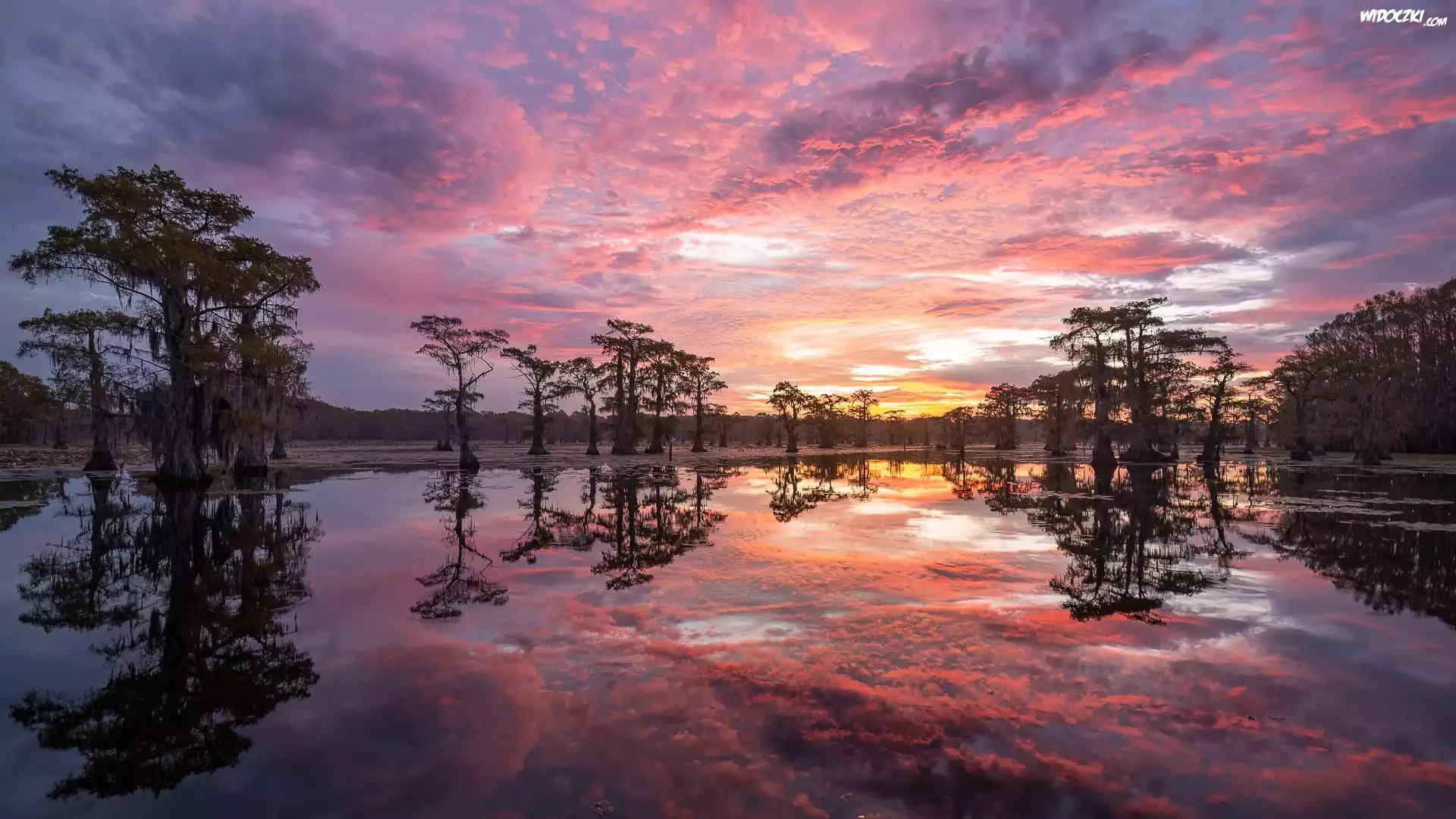 Zdjęcia, Jezioro, Caddo Lake, Las, Drzewa, Zachód słońca, Chmury, Stan Teksas, Stany Zjednoczone
