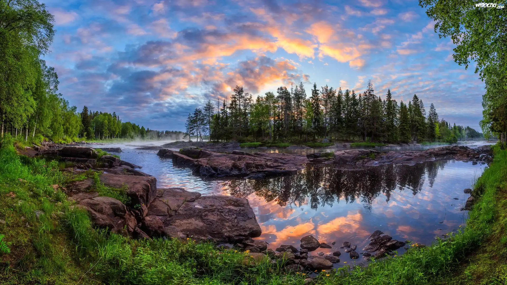 Zdjęcia, Rzeka Kiiminkijoki, Teren Koiteli, Kiiminki, Finlandia, Drzewa, Brzeg, Kamienie, Skały, Chmury