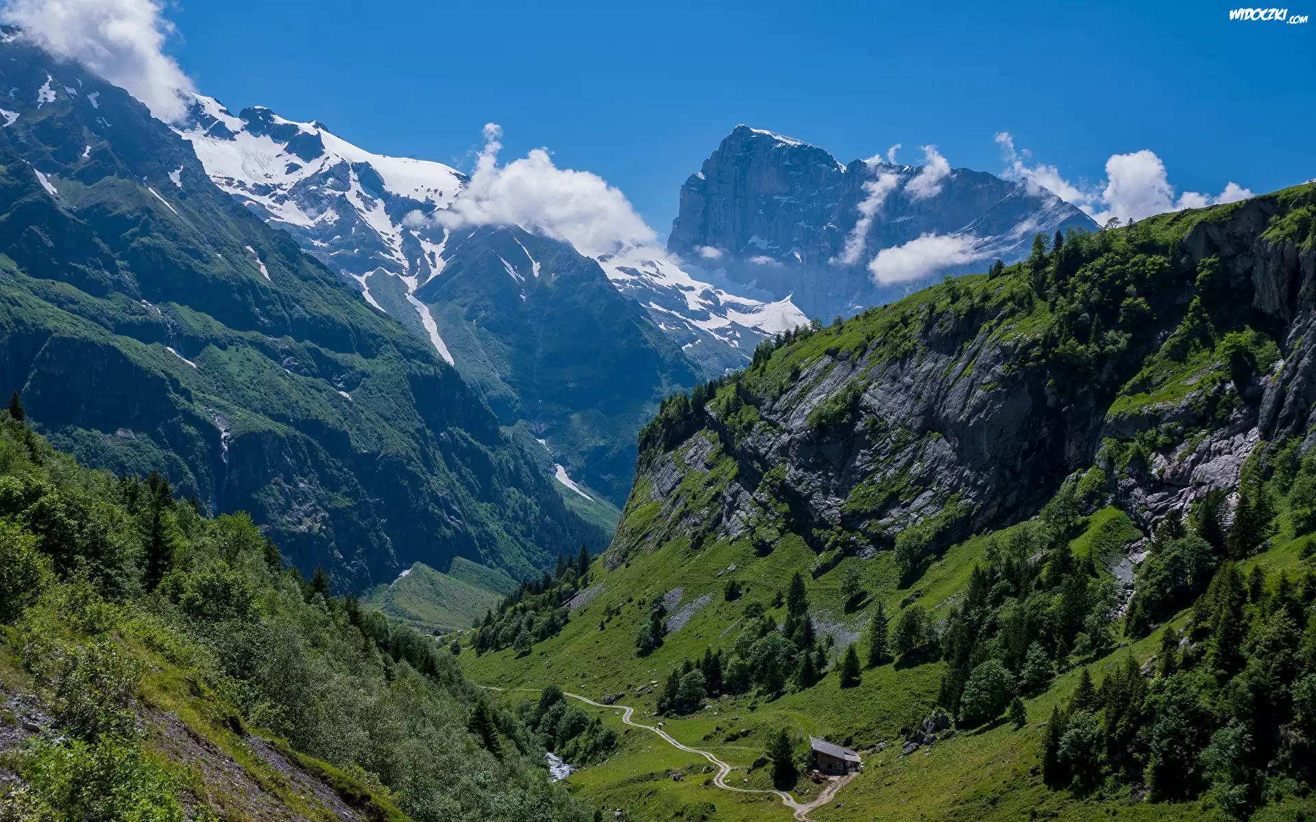 Góry, Alpy Berneńskie, Szczyt Titlis, Skały, Lasy, Drzewa, Dolina, Roślinność, Engelberg, Kanton Obwalden, Szwajcaria |