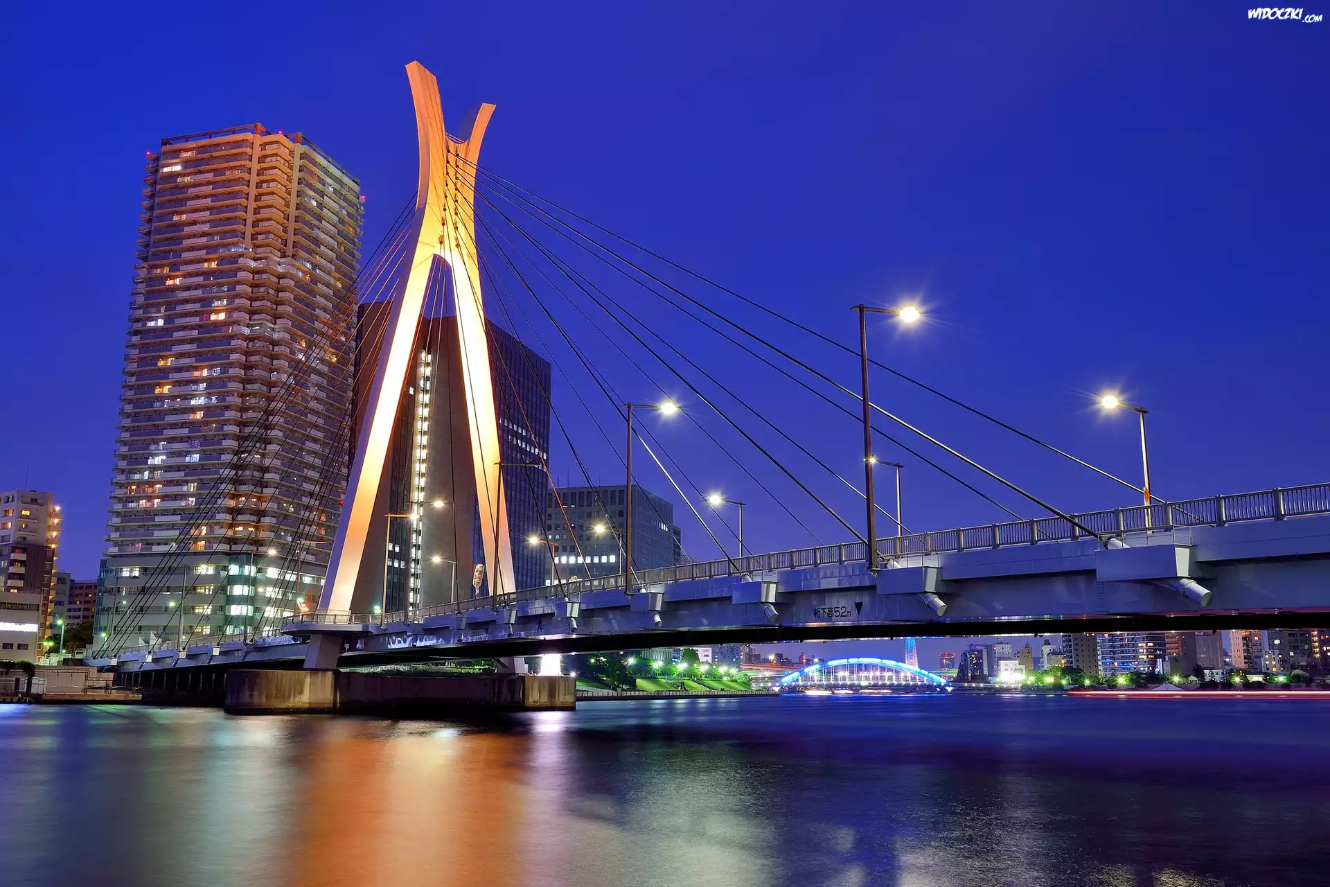 Zdjęcia, Tokio, Japonia, Rzeka, Most, Wieżowce, Zmrok