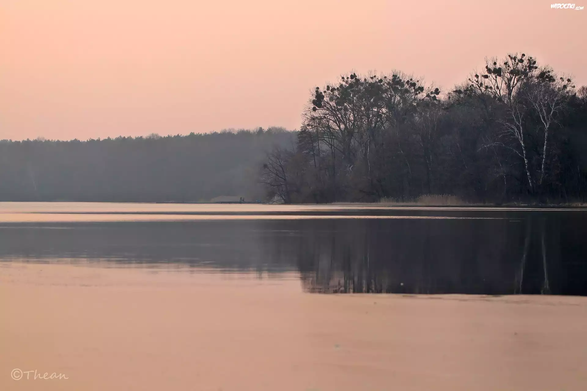 Topniejące, Jezioro, Drzewa, Zmierzch