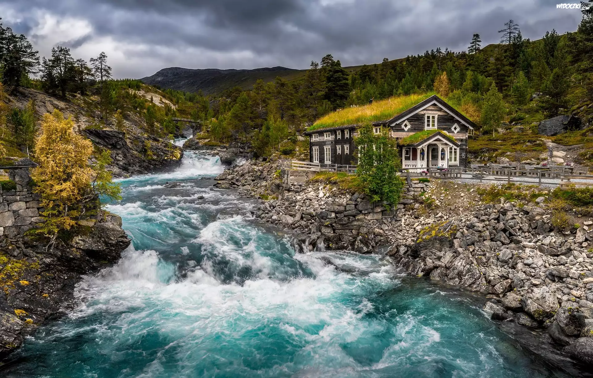 Góry, Rzeka Tora, Dom, Drzewa, Kamienie, Miejscowość Skjak, Region Oppland, Norwegia