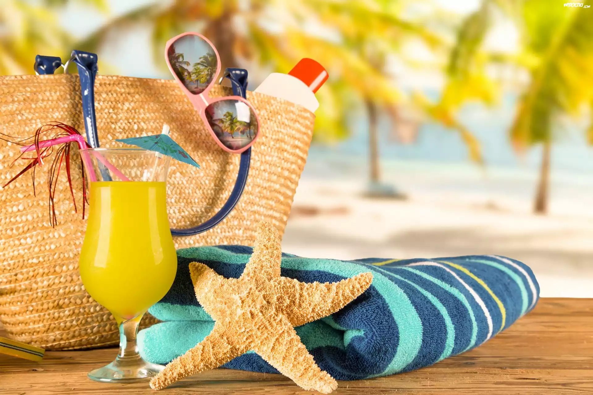 Zdjęcia, Lato, Torebka, Okulary, Ręcznik, Rozgwiazda, Napój, Wakacje