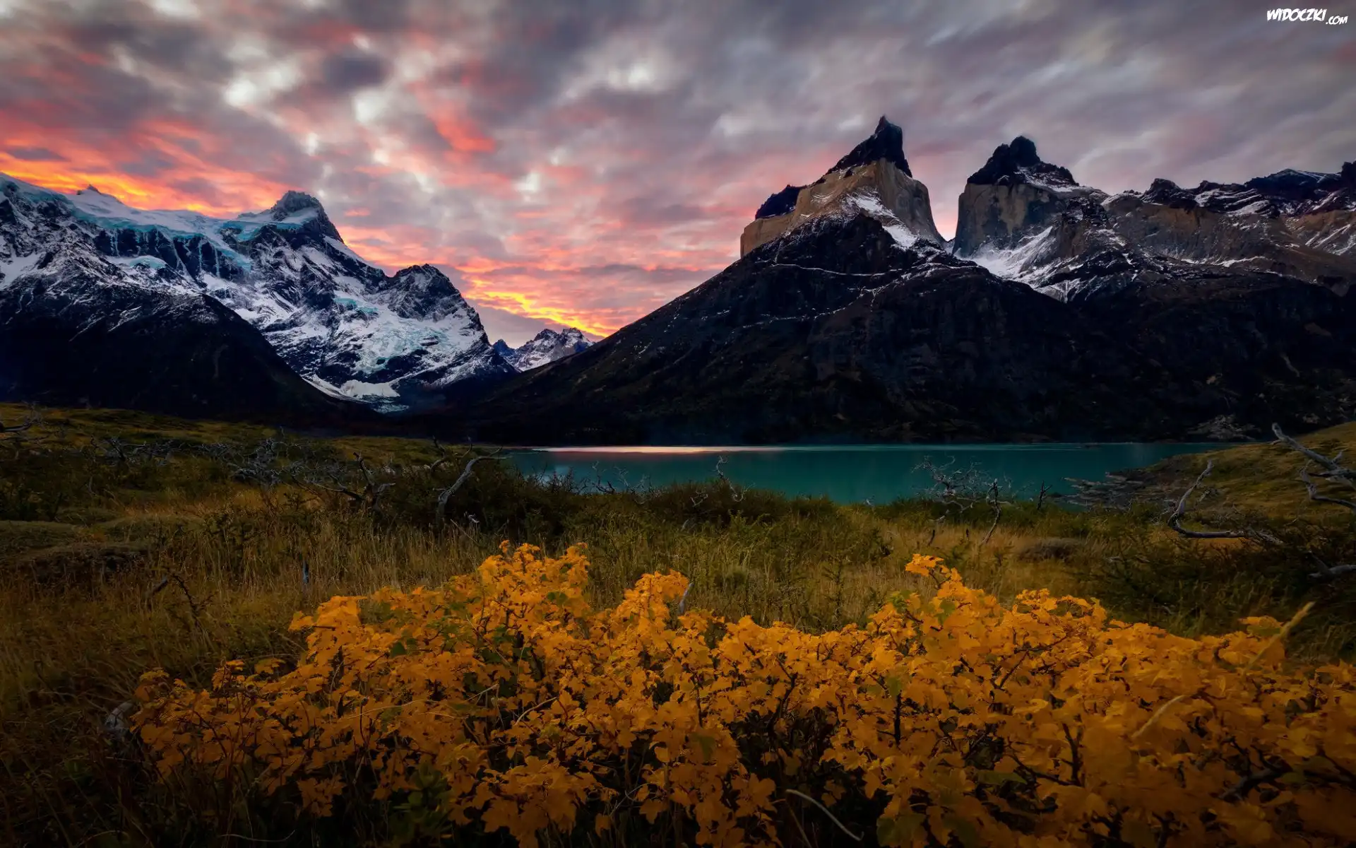 Jesień, Góry, Cordillera del Paine, Masyw, Torres del Paine, Jezioro, Chmury, Park Narodowy Torres del Paine, Zachód słońca, Patagonia, Chile |