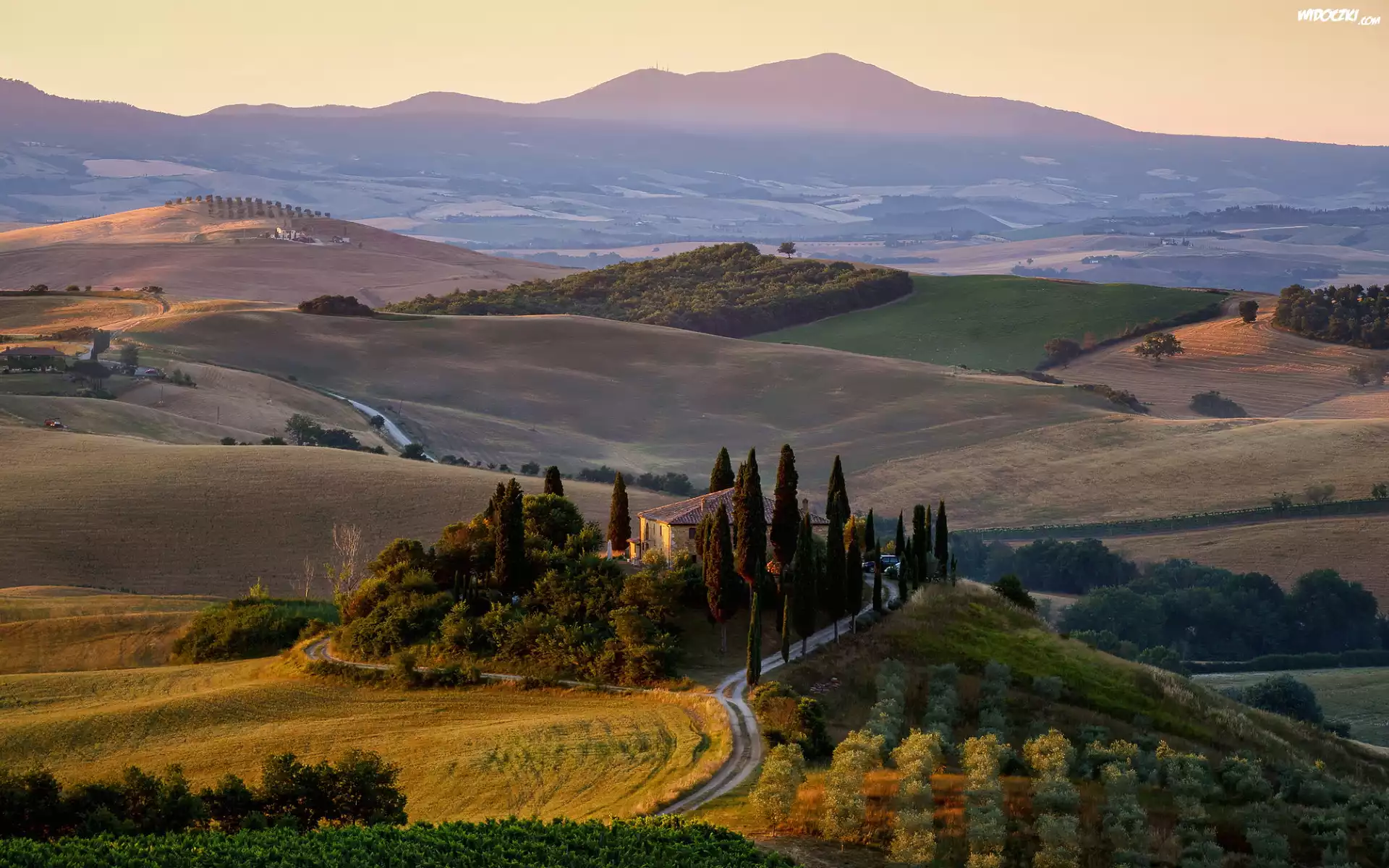 Włochy, Toskania, Wzgórza, Droga, Pola, Winnice, Cyprysy, Dom
