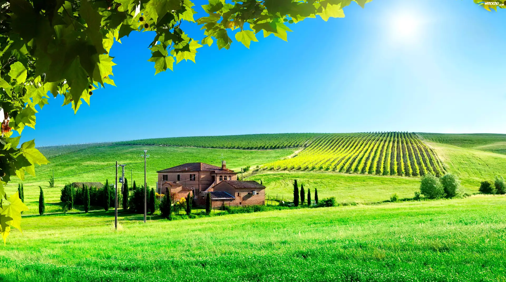 Toskania, Dom, Pola, Drzewa, Promienie, Słońca