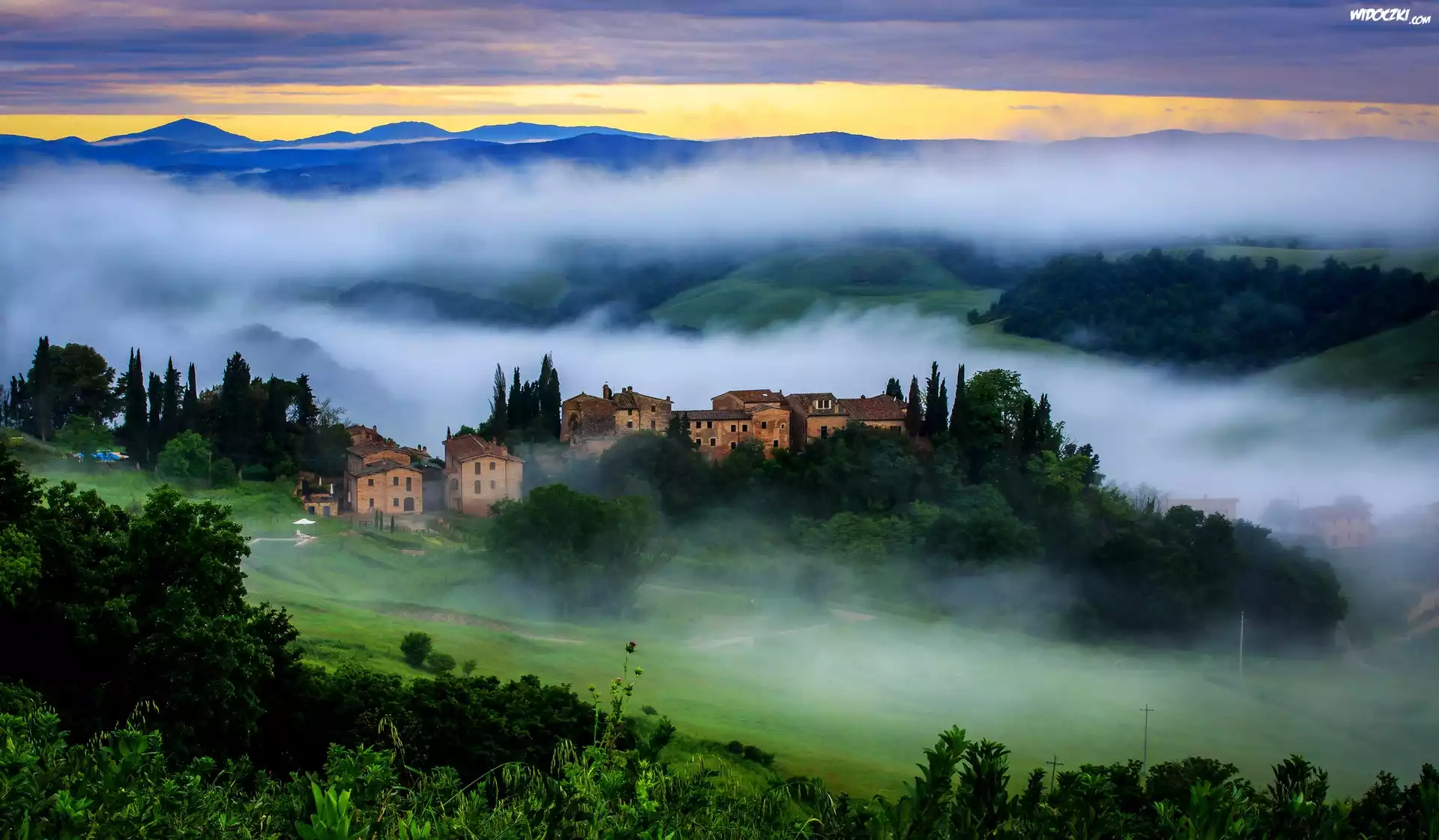 Toskania, Włochy, Mgła, Wschód Słońca, Budynki