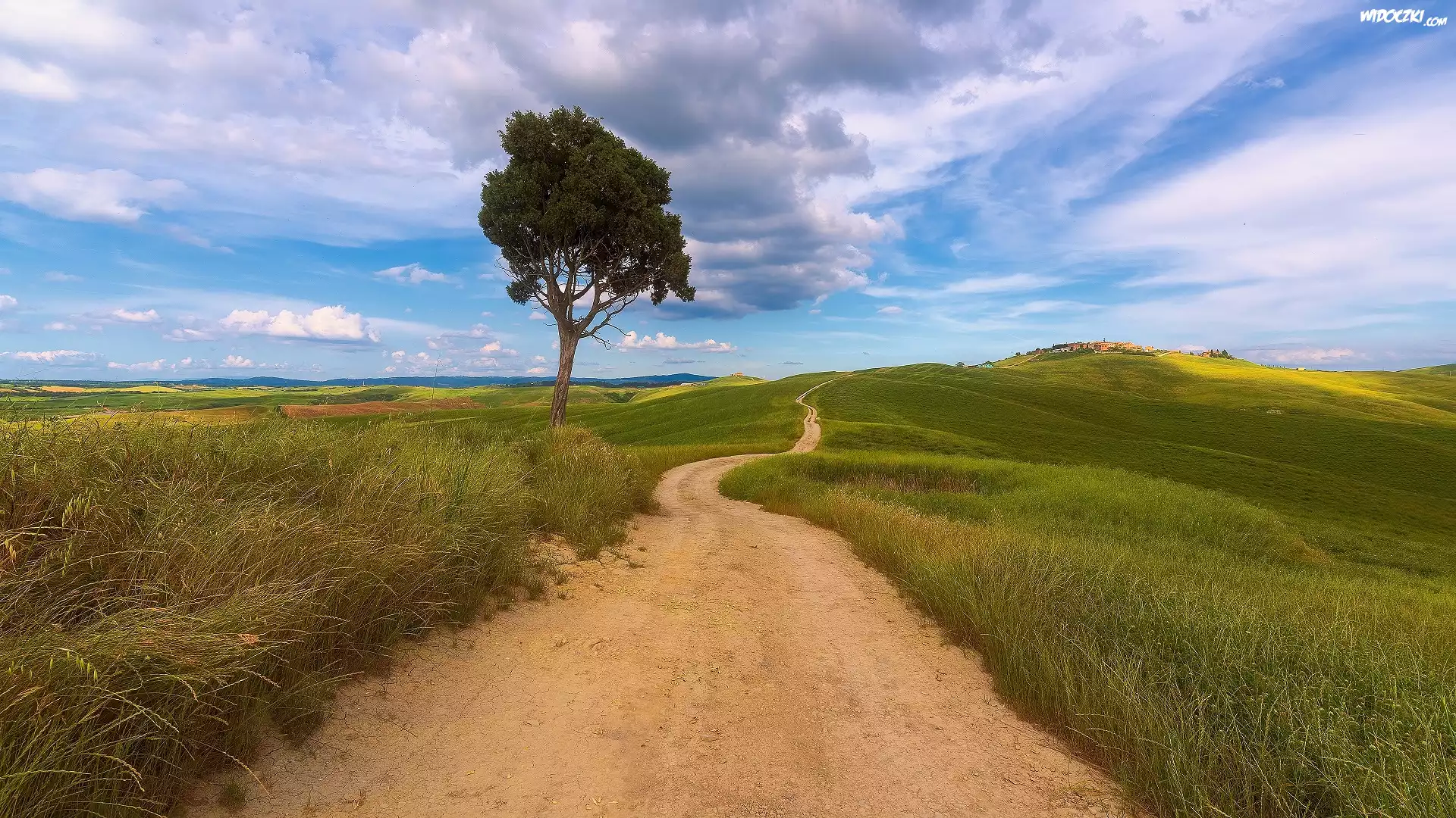Zdjęcia, Włochy, Toskania, Wzgórza, Pola, Łąki, Droga, Drzewo