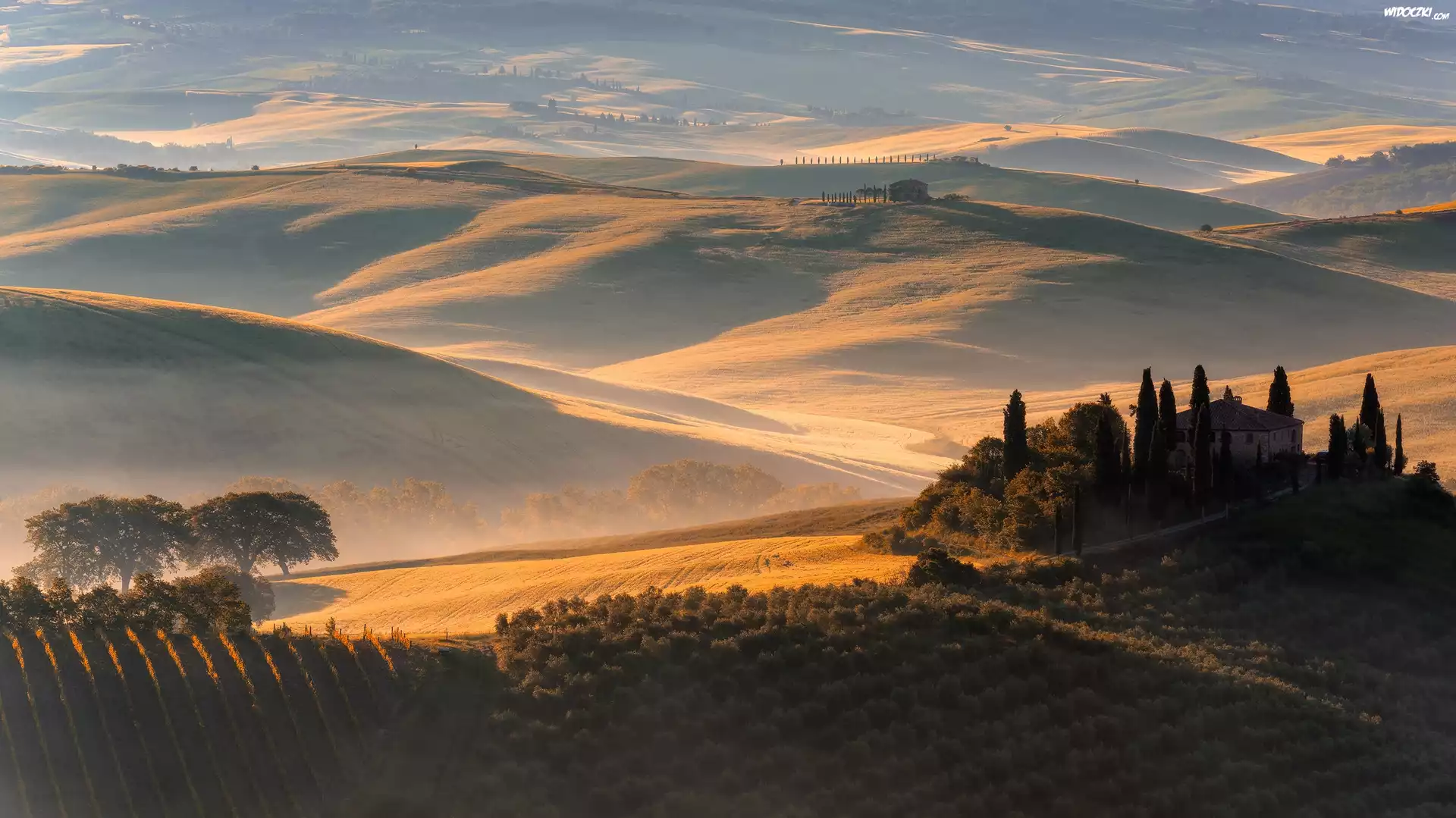 Włochy, Toskania, Pola, Wzgórza, Drzewa, Cyprysy, Mgła