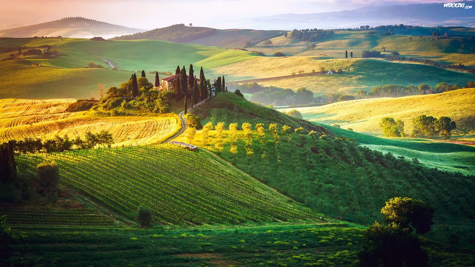 Zdjęcia, Włochy, Toskania, Domy, Pola, Drzewa, Góry, Mgła, Wzgórza