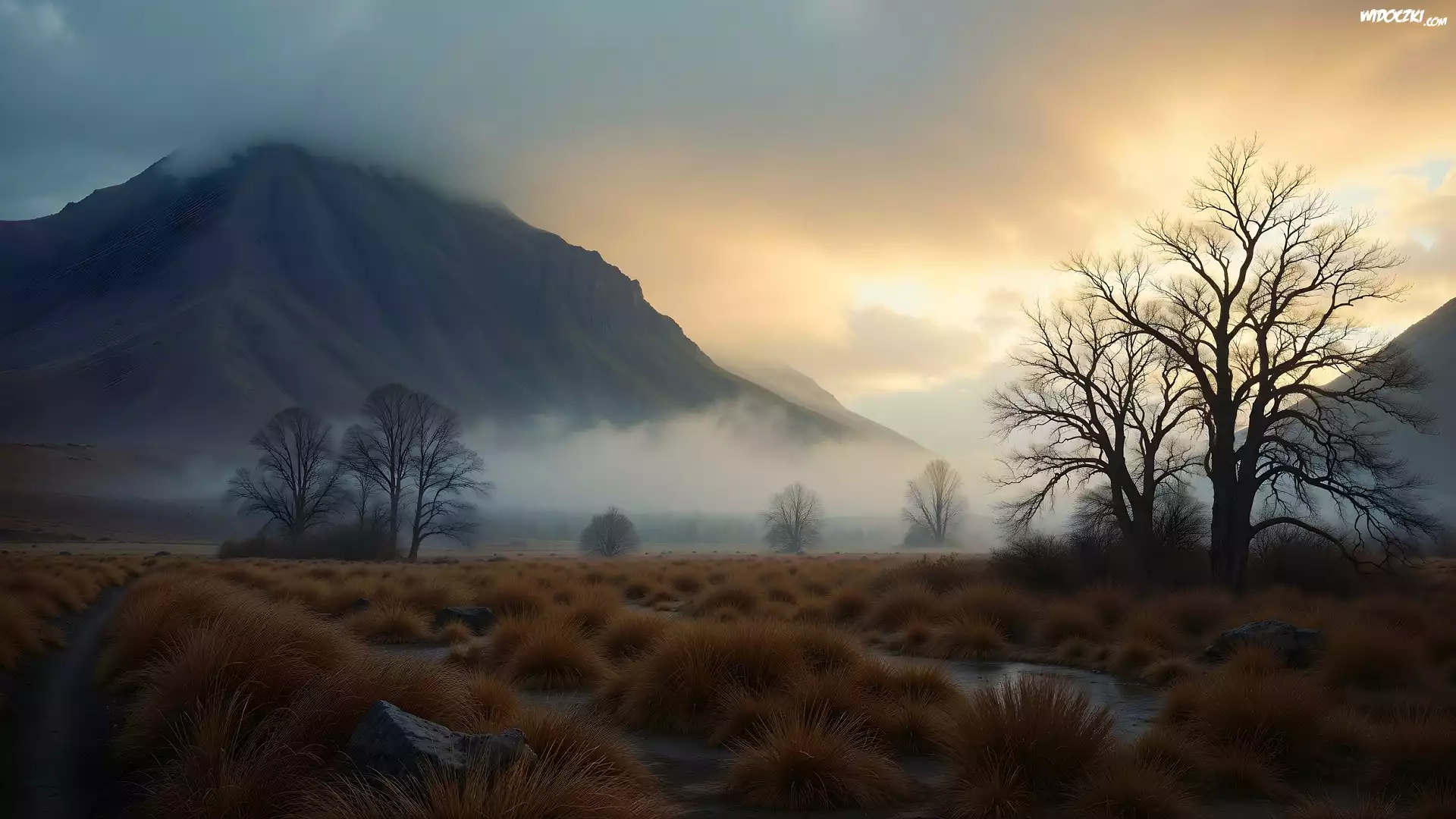 Jesień, Drzewa, Kępki, Traw, Mokradła, Mgła, Góra