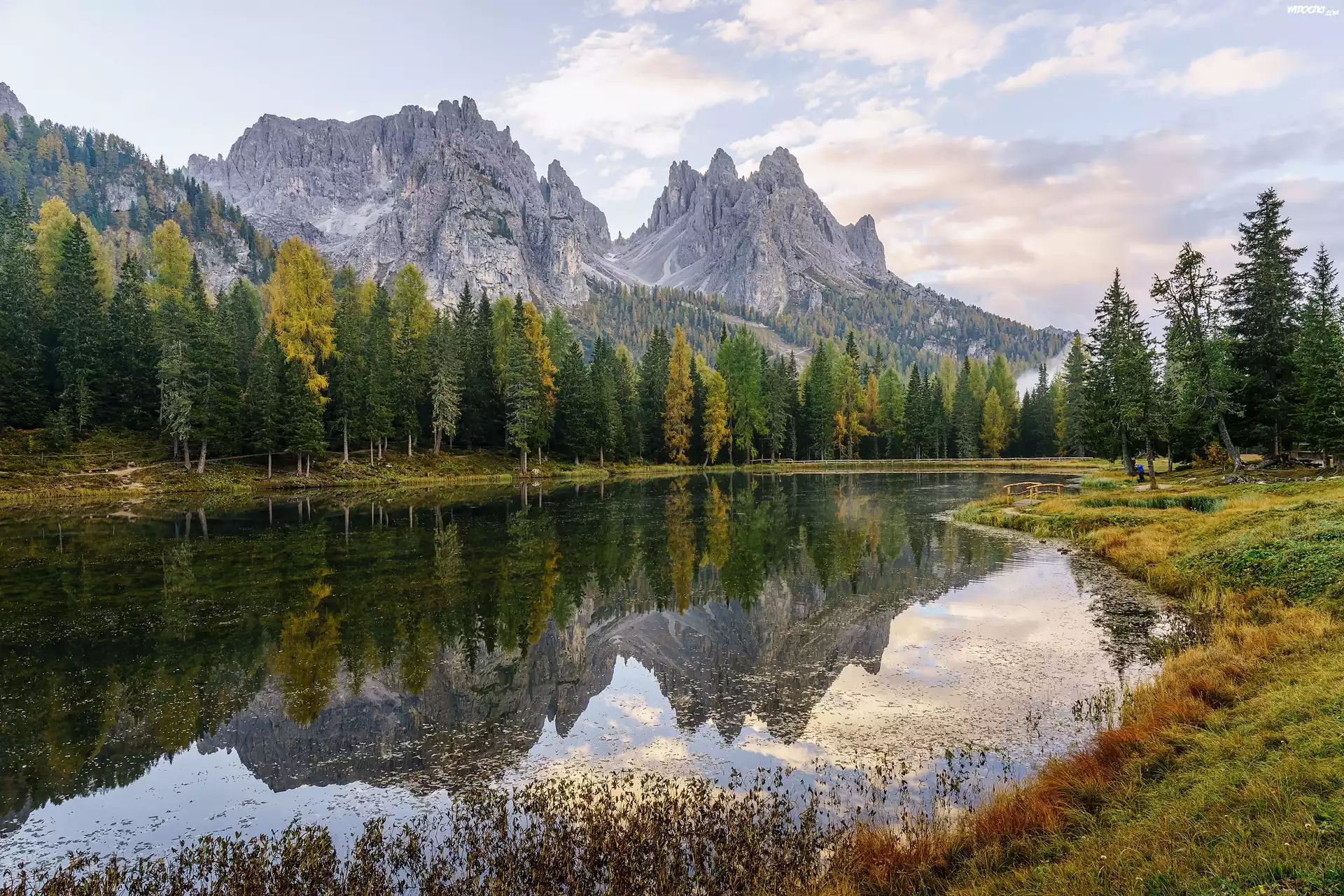 Zdjęcia, Włochy, Dolomity, Jezioro Lago di Antorno, Góry, Las, Drzewa, Trawa