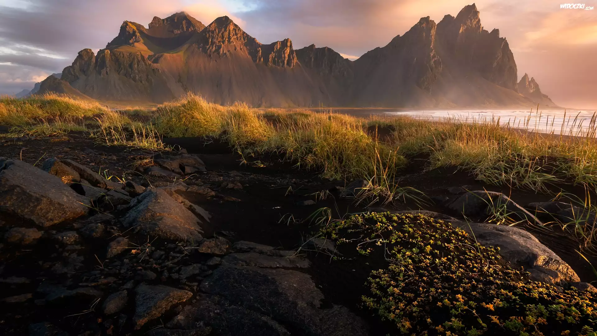 Wschód słońca, Góra, Vestrahorn, Islandia, Morze, Skały, Kamienie, Trawa