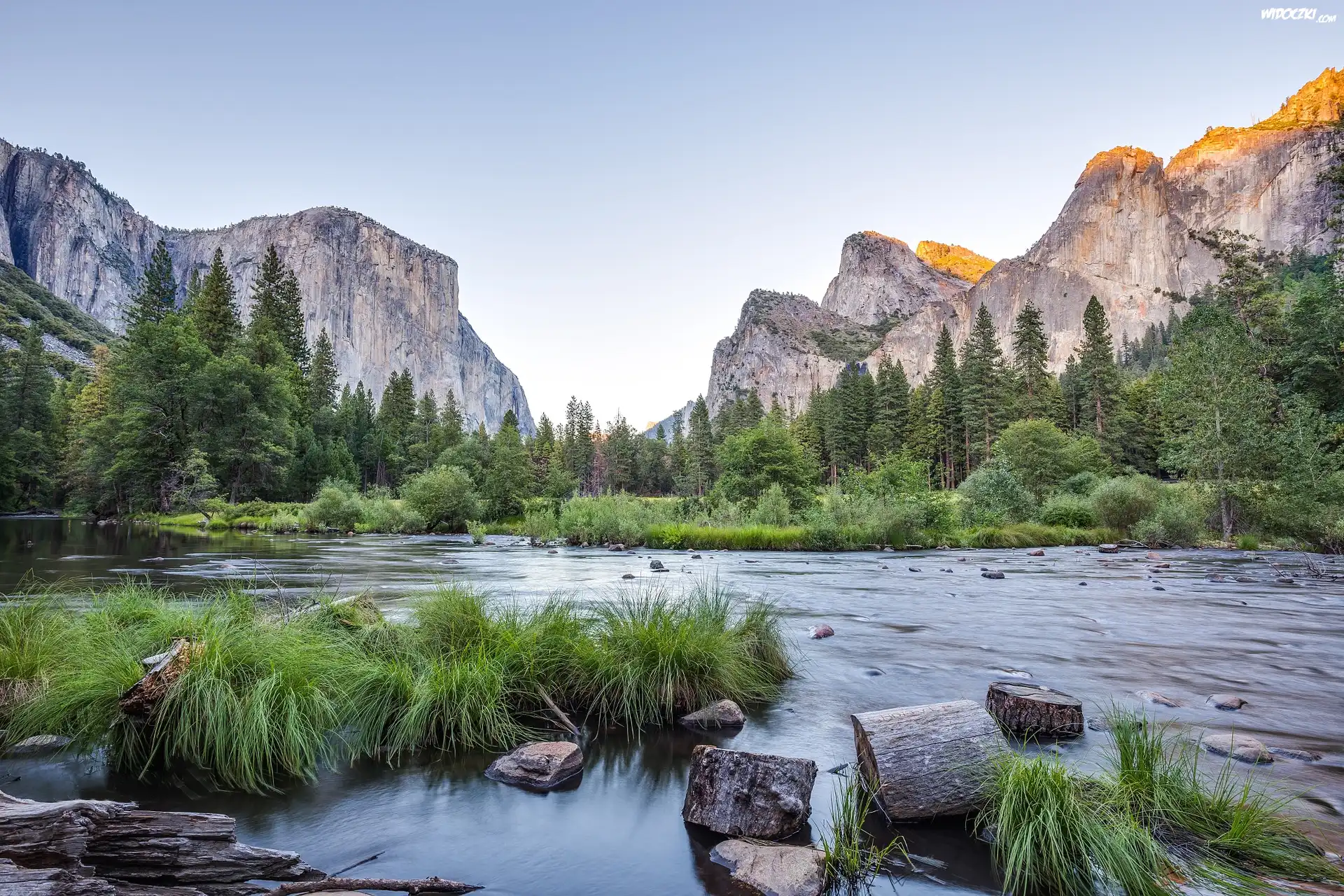 Góry Sierra Nevada, Drzewa, Trawa, Rzeka Merced, Kamienie, Park Narodowy Yosemite, Kalifornia, Stany Zjednoczone |
