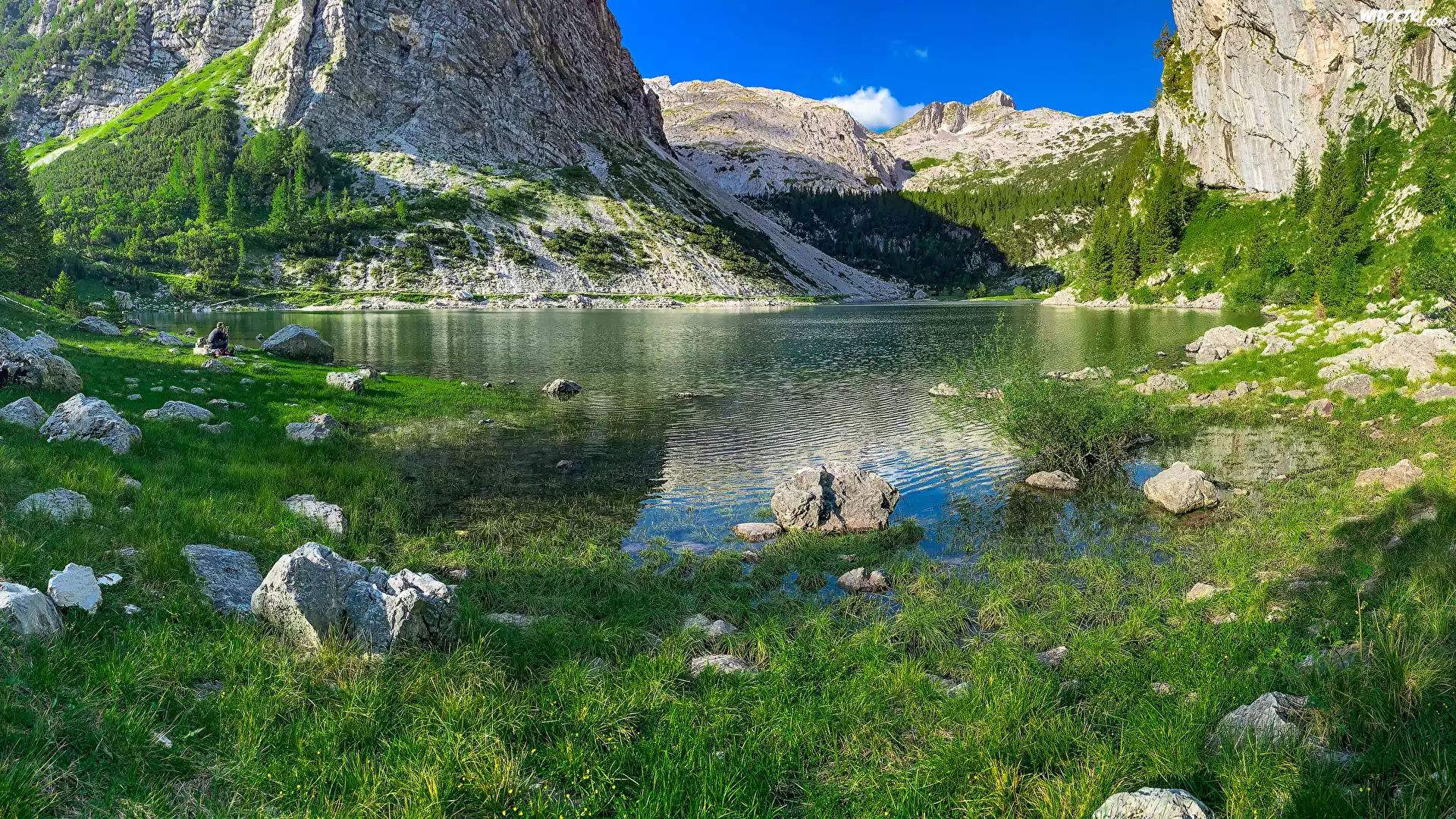 Zdjęcia, Słowenia, Jezioro, Krn Lake, Góry, Krn Mountains, Kamienie, Trawa
