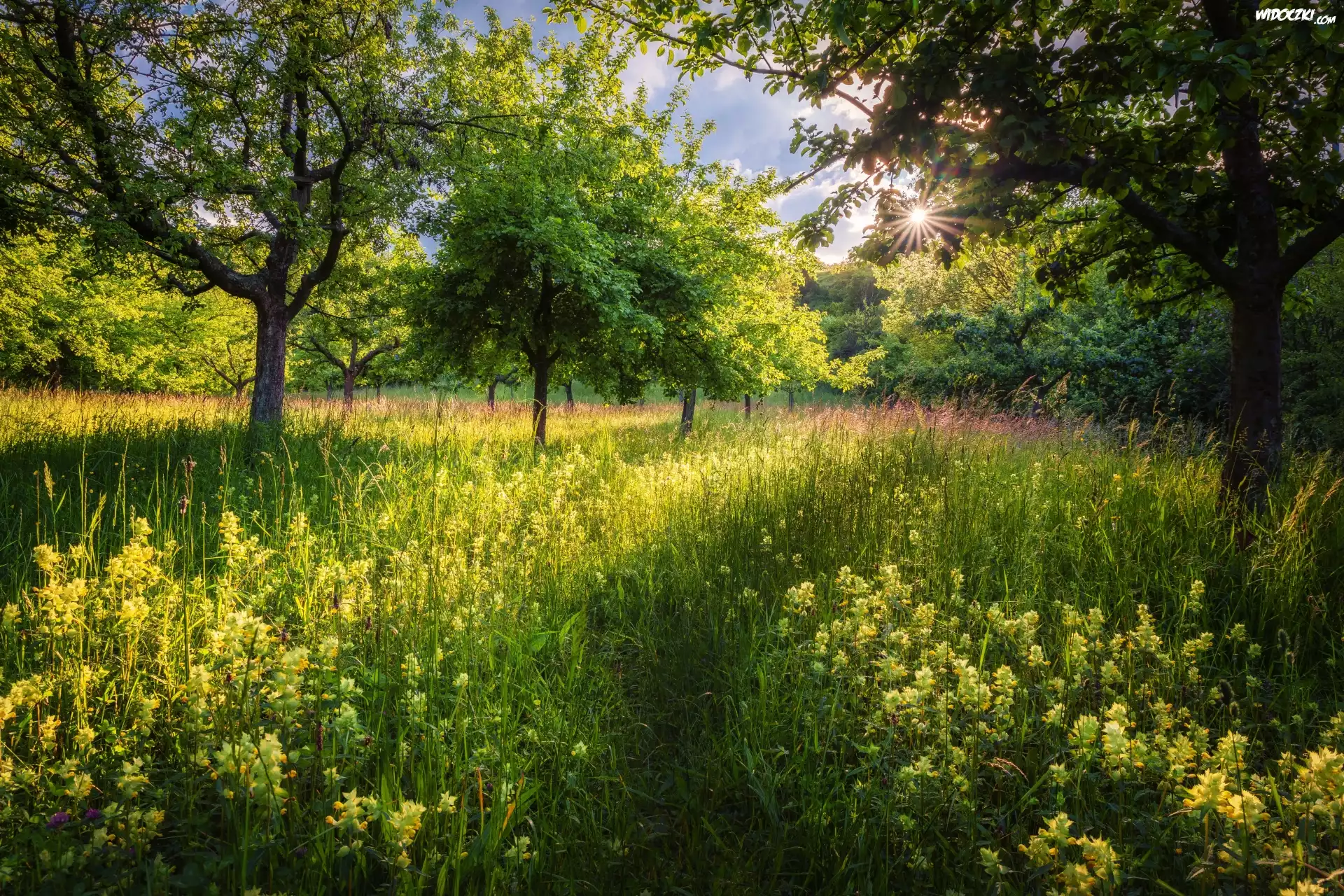 Zdjęcia, Kwiaty, Trawa, Drzewa, Zieleń, Promienie słońca, Lato