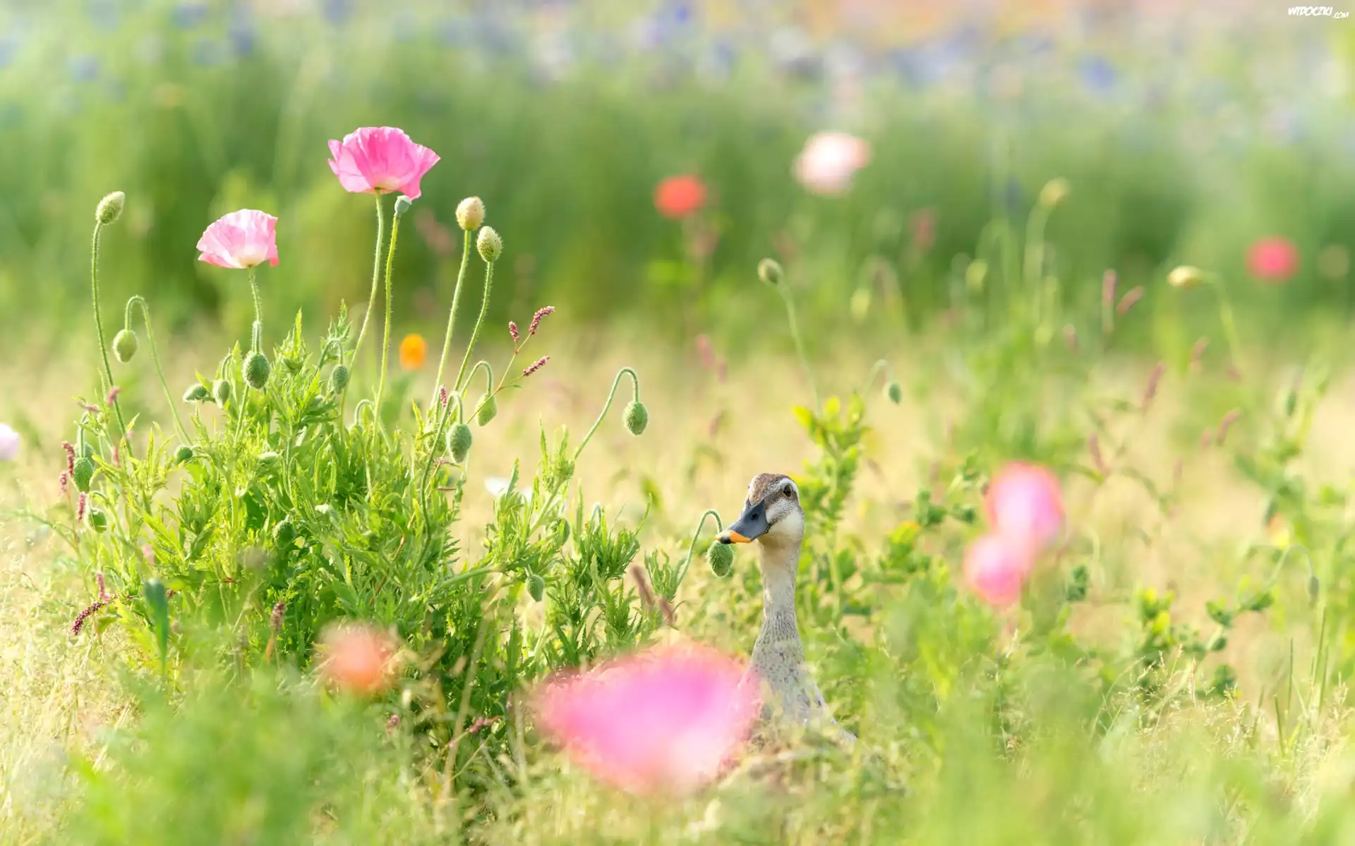 Zdjęcia, Łąka, Kwiaty, Maki, Trawa, Kaczka