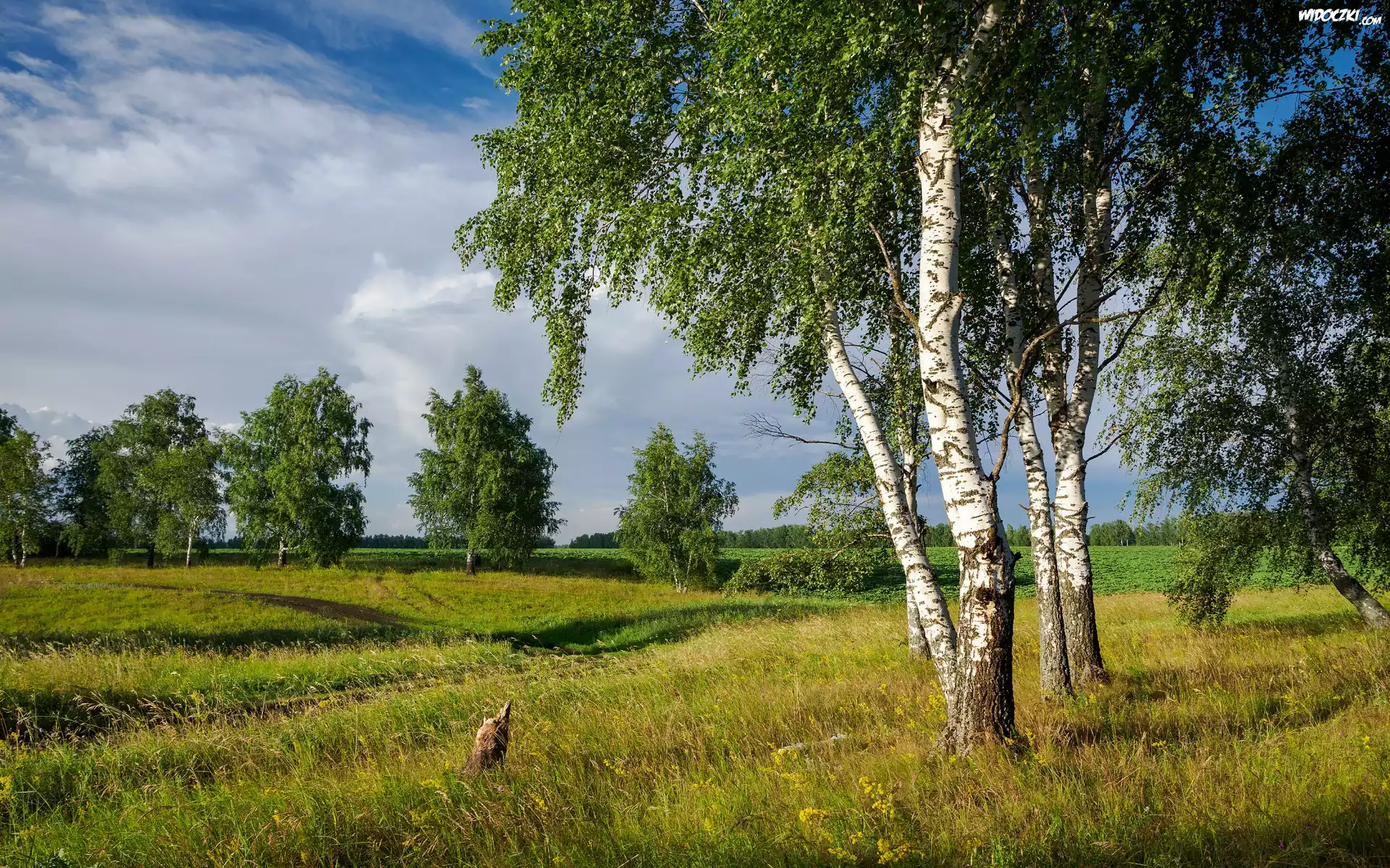 Zdjęcia, Drzewa, Brzozy, Łąka, Trawa, Chmury, Lato