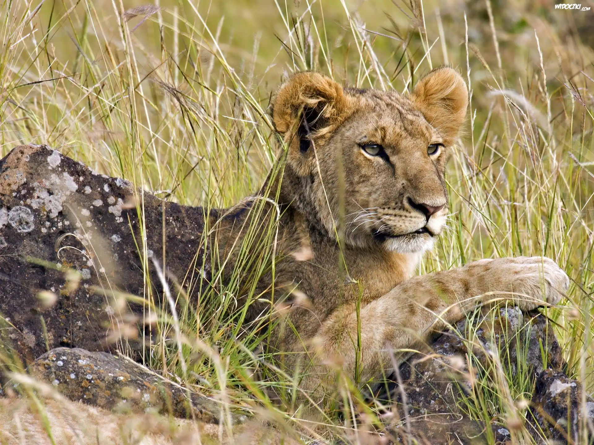 Zdjęcia, Lew, Trawa, Kamień