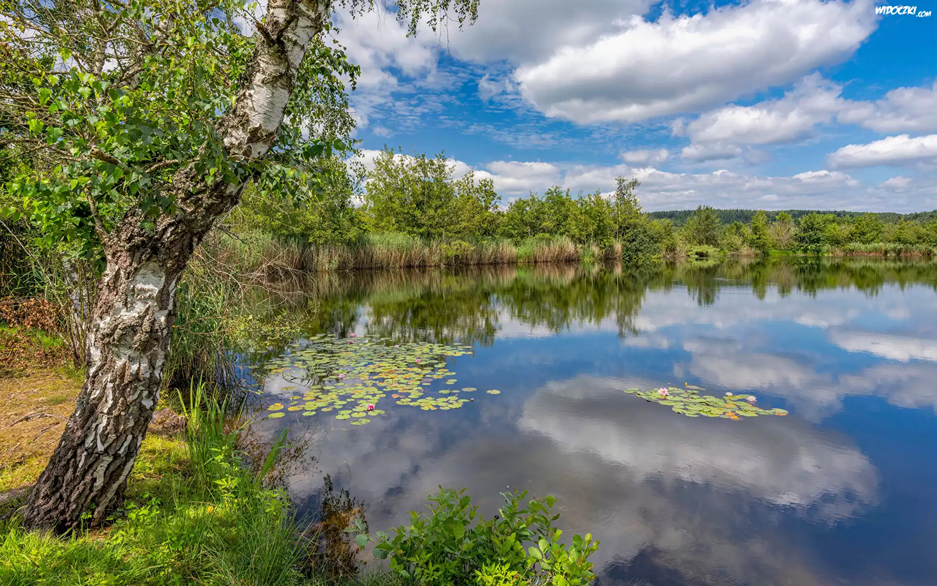 Zdjęcia, Jezioro, Drzewa, Brzoza, Trawa, Chmura, Odbicie