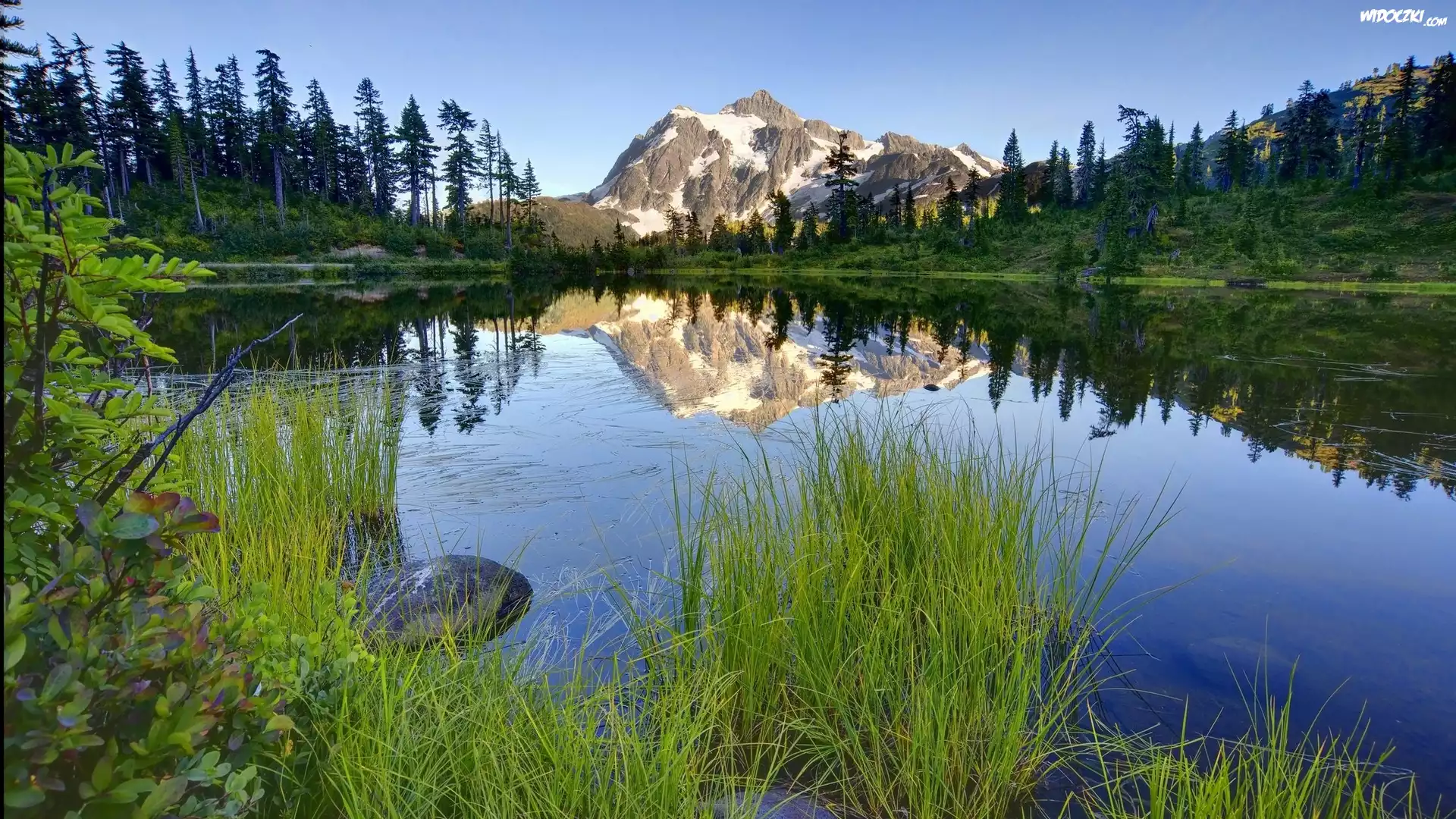 Zdjęcia, Porośnięty, Trawą, Brzeg, Jeziora, Las, Iglasty, Góry, Odbicie