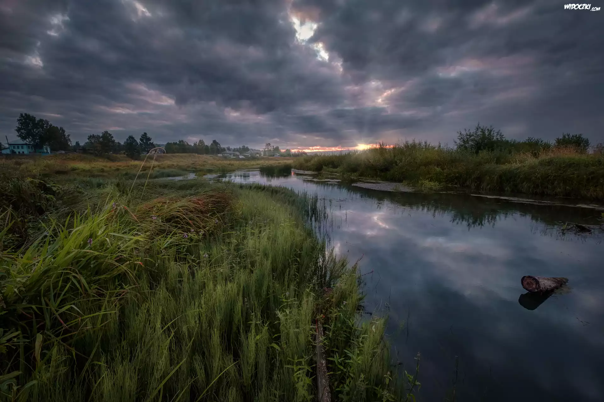 Rzeka, Trawa, Drzewa, Ciemne, Chmury, Wschód słońca