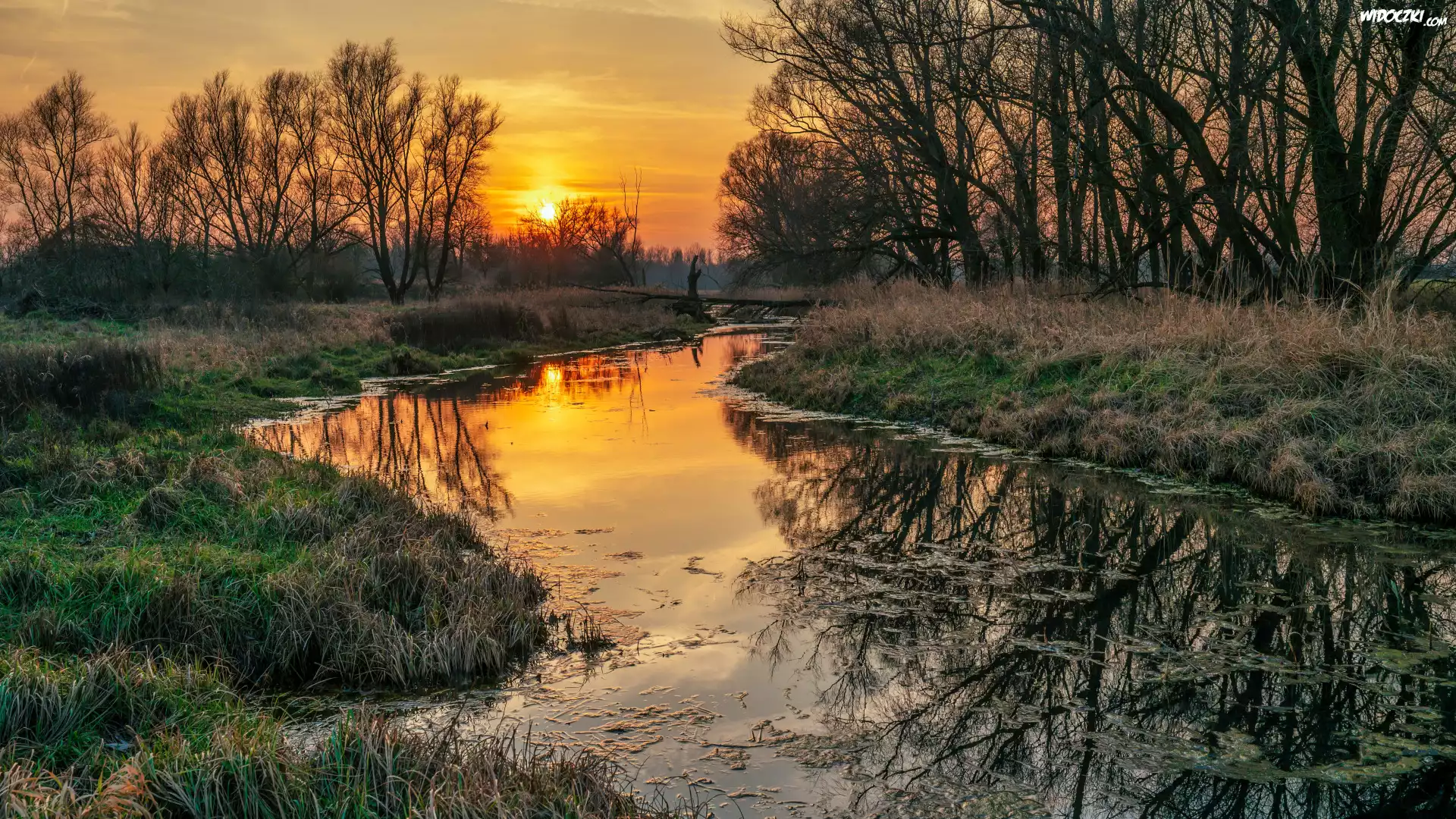 Rzeka, Las, Drzewa, Trawa, Zachód słońca