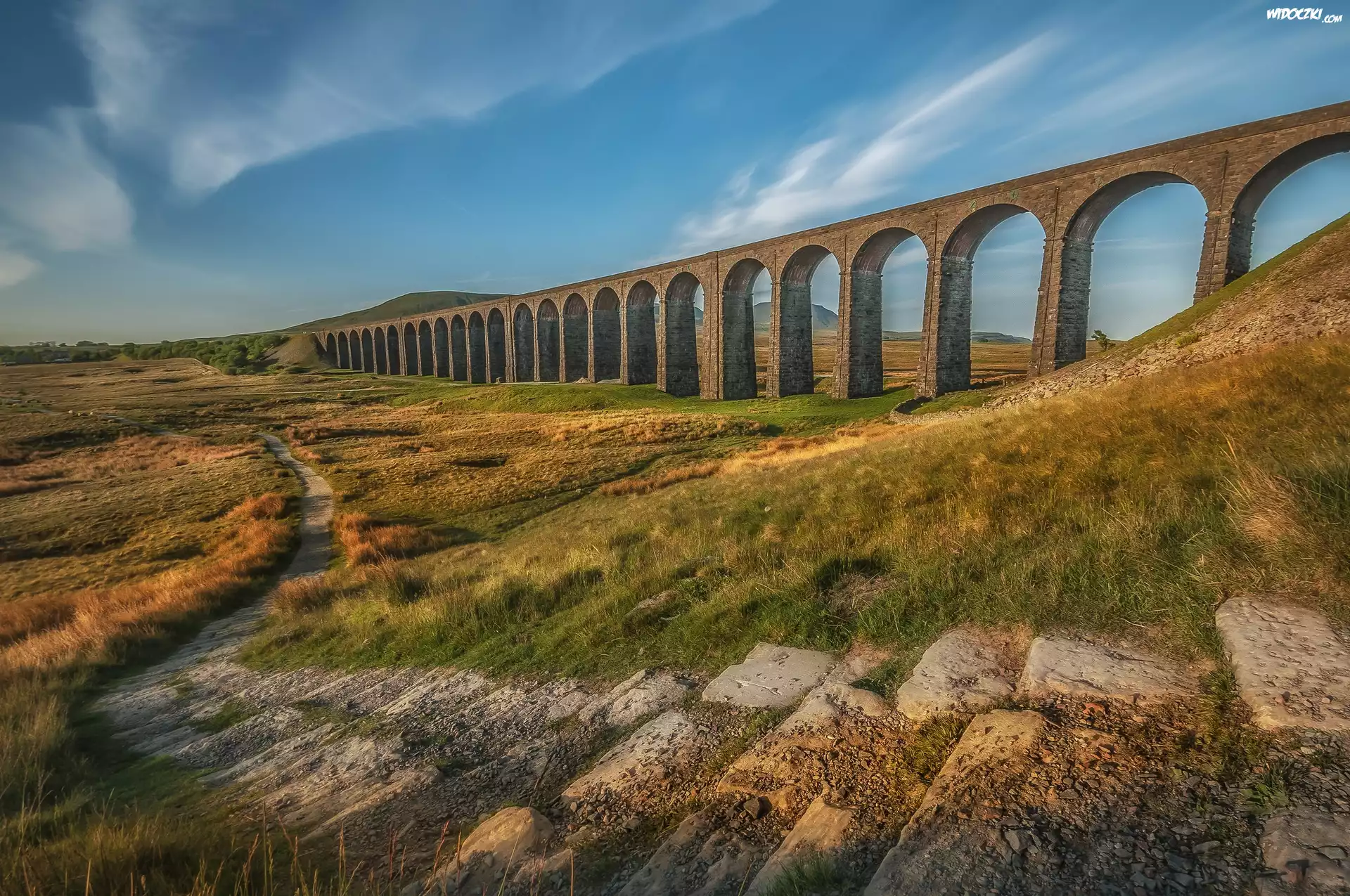 Anglia, Yorkshire, Wiadukt kolejowy Ribblehead, Most, Kamienie, Dróżka, Trawa