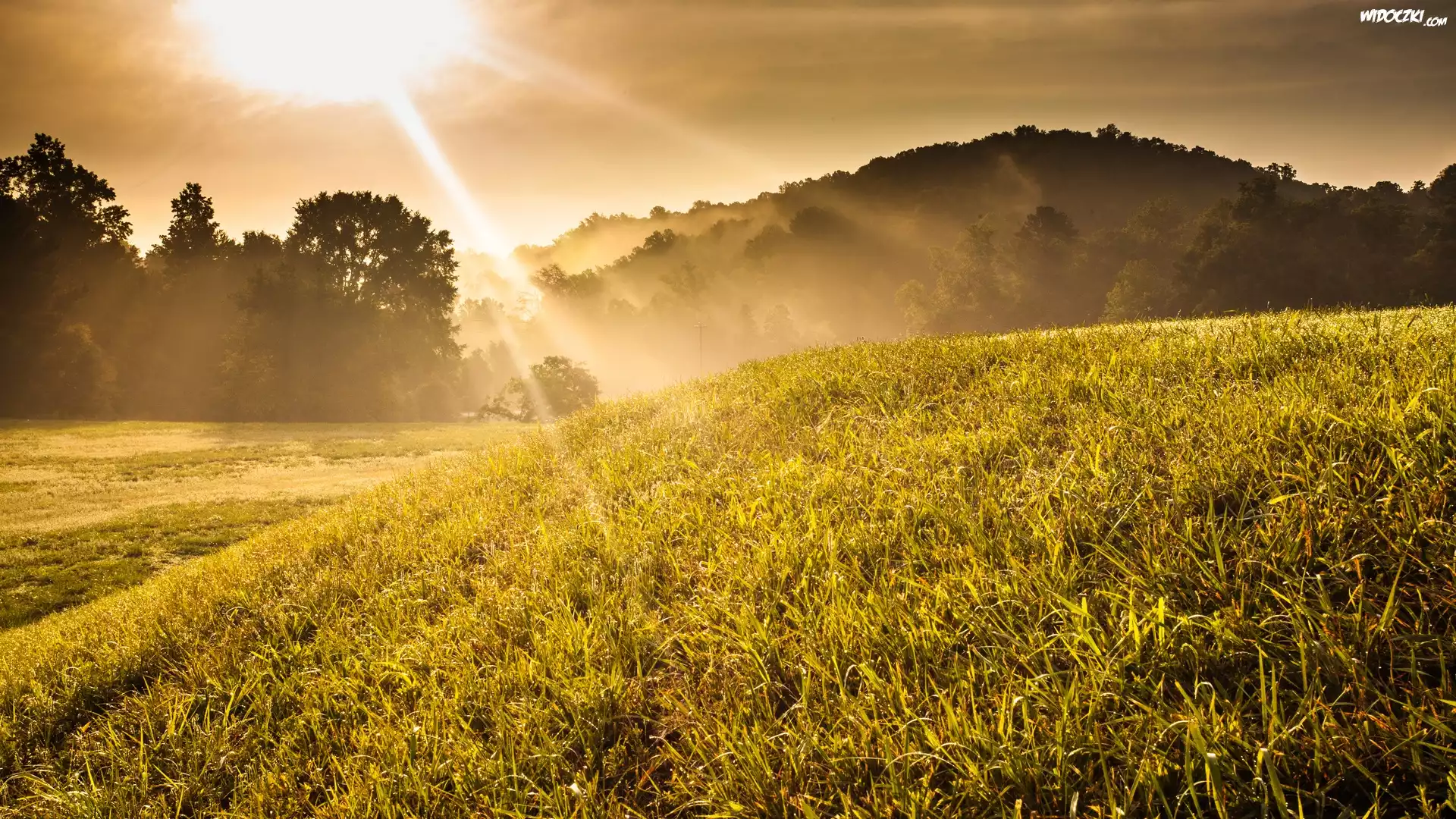 Zdjęcia, Trawa, Drzewa, Zachód, Słońca