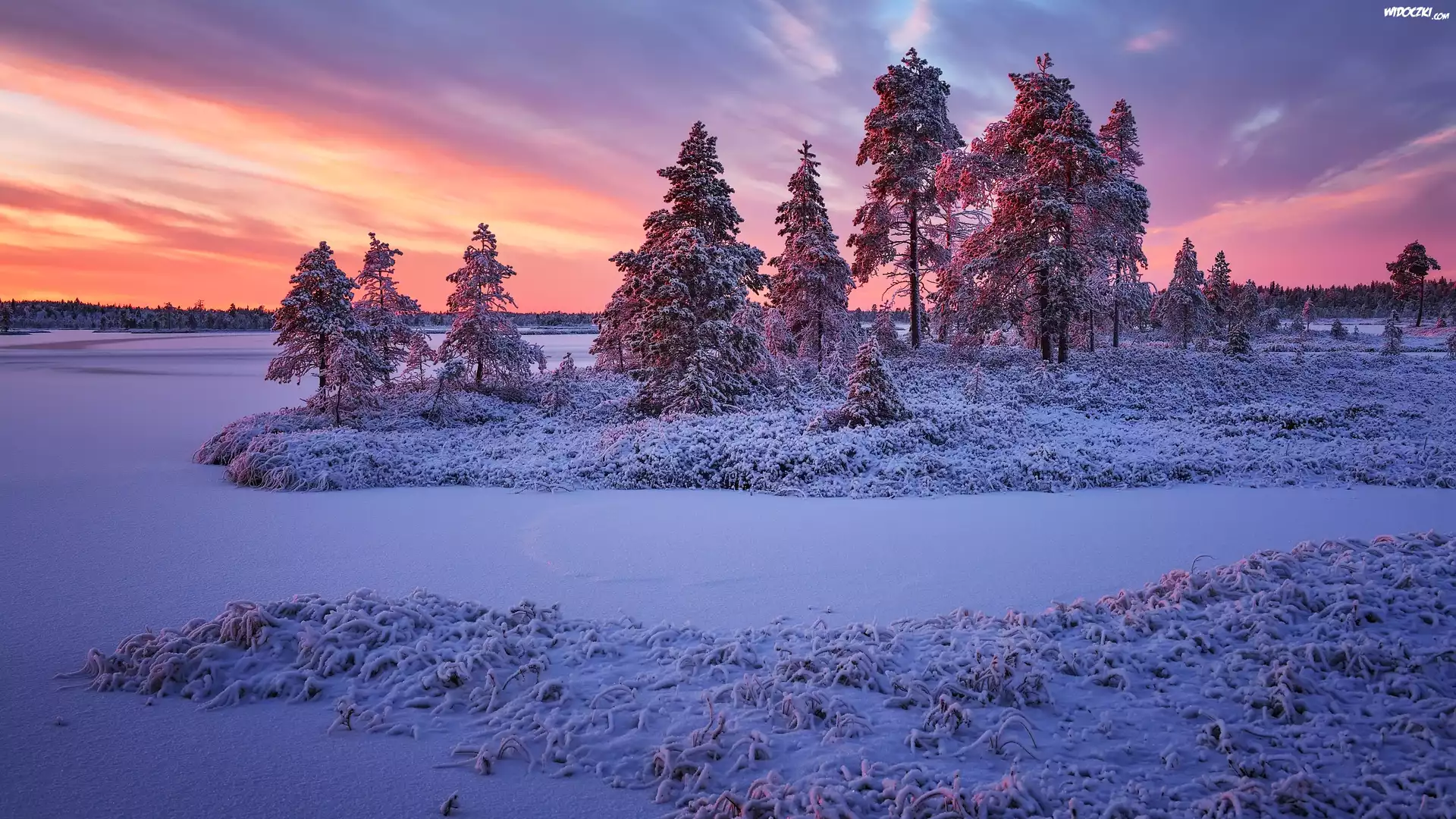 Zdjęcia, Zima, Drzewa, Ośnieżone, Trawa