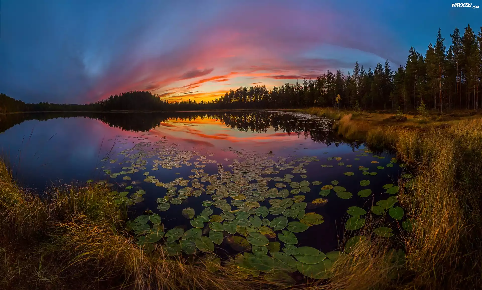 Zdjęcia, Jezioro, Trawy, Liście, Nenufary, Zachód słońca, Las, Jesień