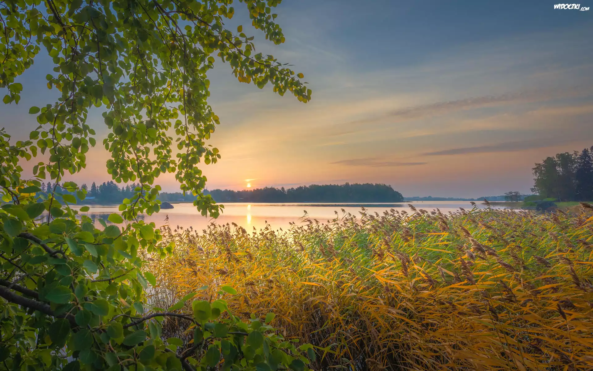 Jezioro, Trawy, Szuwary, Drzewa, Gałęzie, Wschód słońca