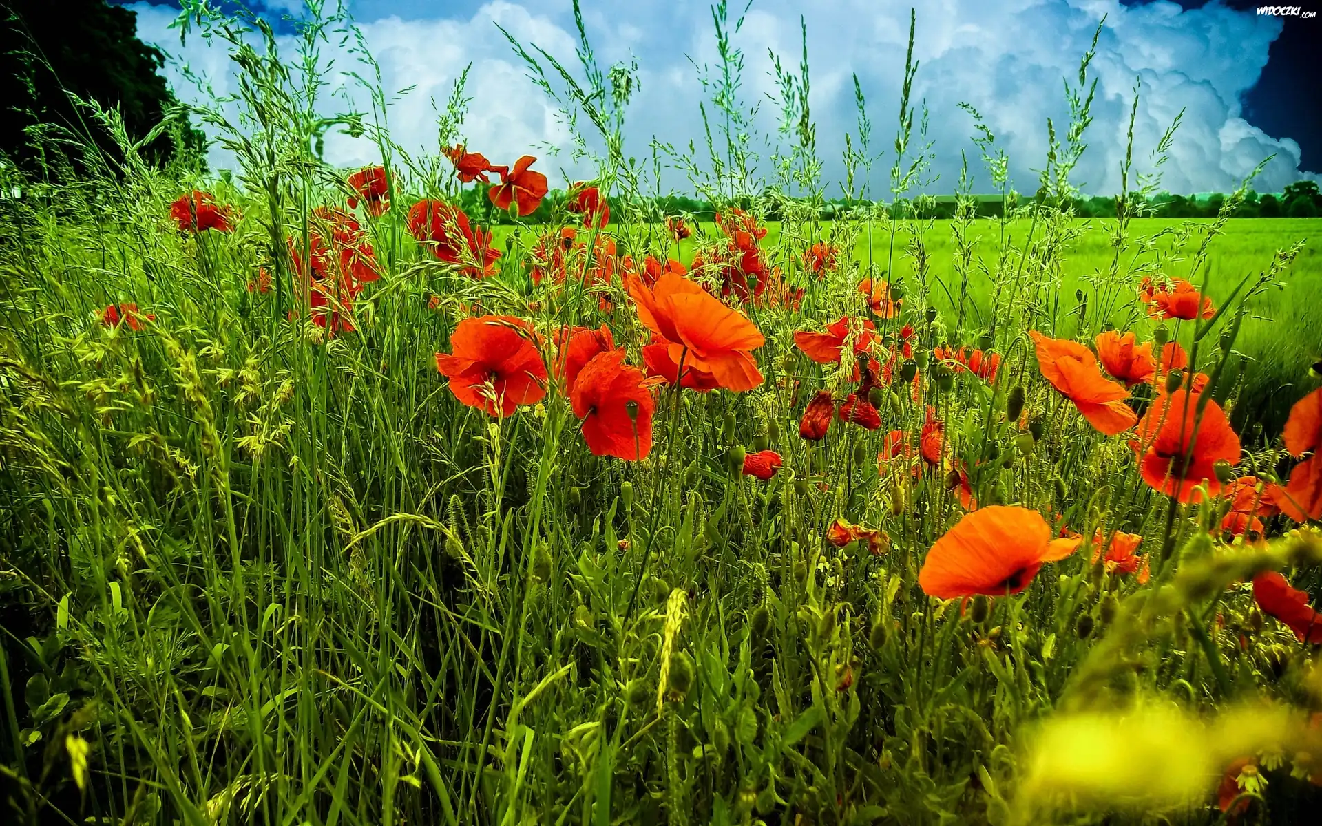 Łąka, Maki, Trawy, Chmury