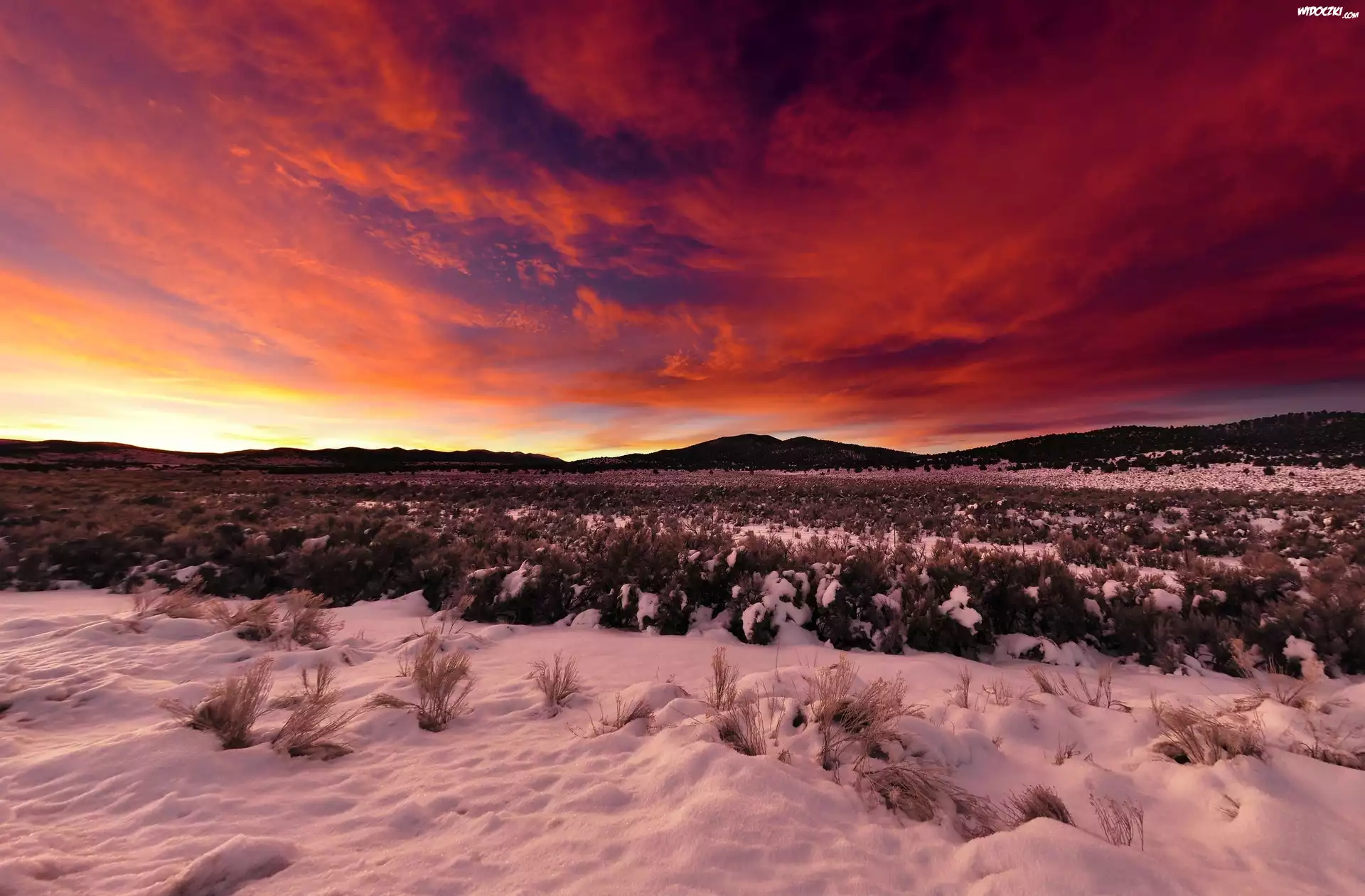 Trawy, Śnieg, Chmury, Zachód Słońca