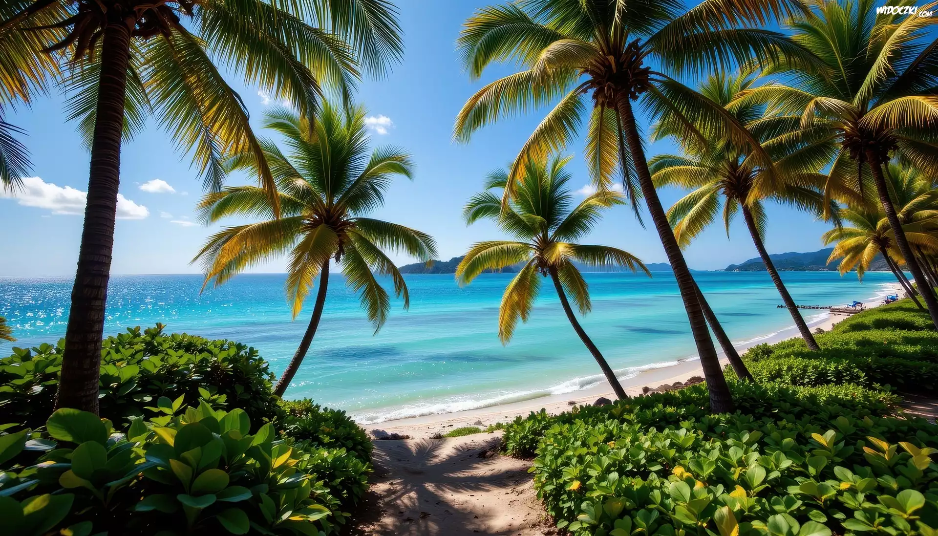 Zdjęcia, Palmy, Rośliny, Morze, Tropiki, Grafika AI