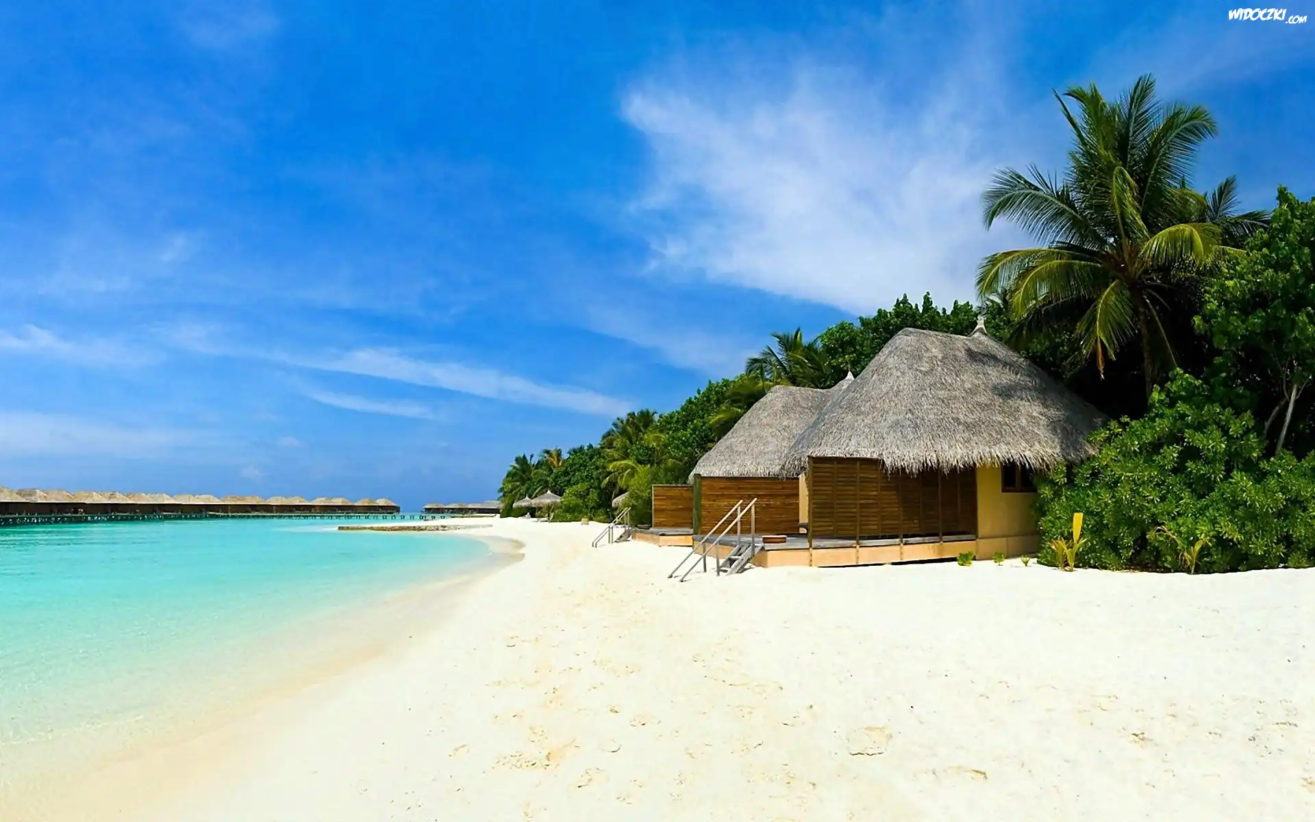 Zdjęcia, Tropiki, Morze, Plaża, Palmy, Domki