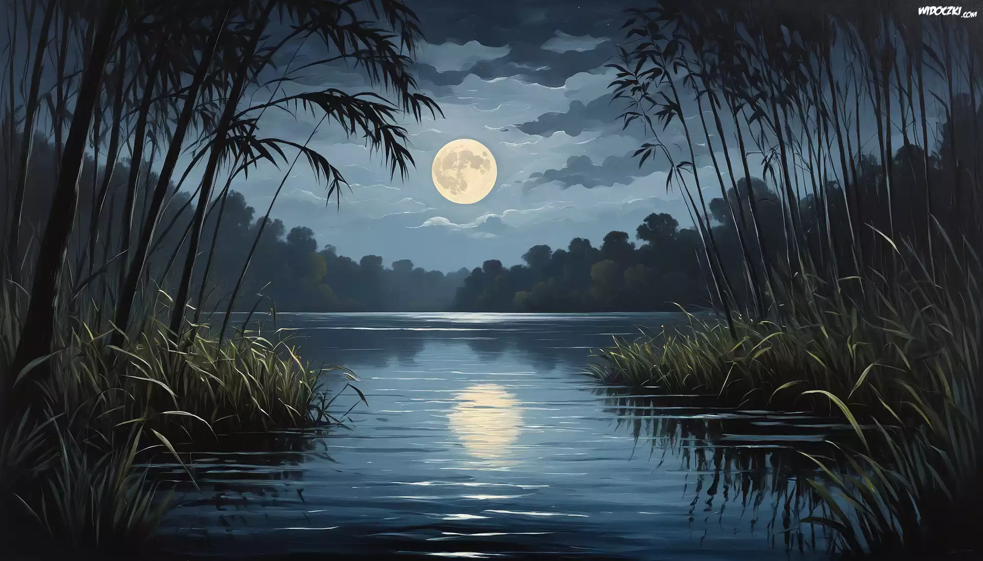 Jezioro, Noc, Księżyc, Trzciny, Odbicie, Grafika
