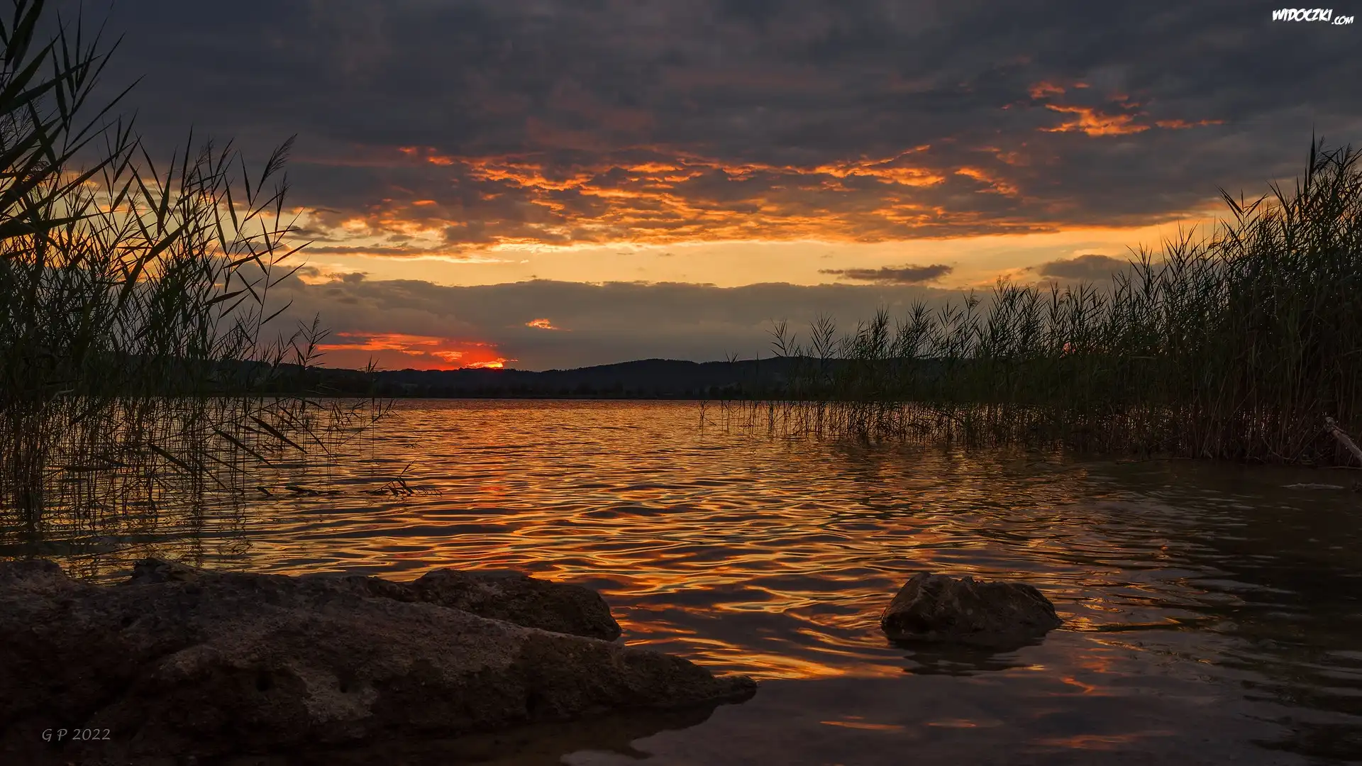 Zachód słońca, Wieczór, Ciemne, Chmury, Jezioro, Skały, Trzciny