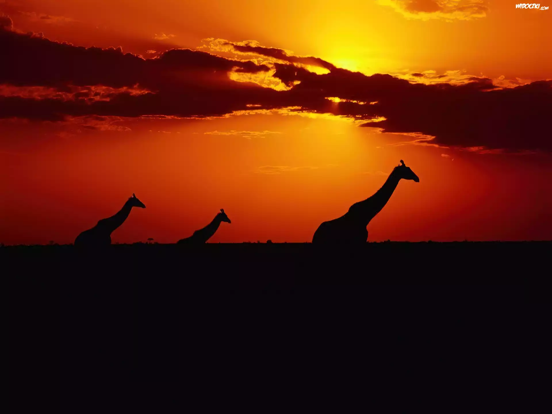 Zdjęcia, Trzy, Żyrafy, Zachód Słońca