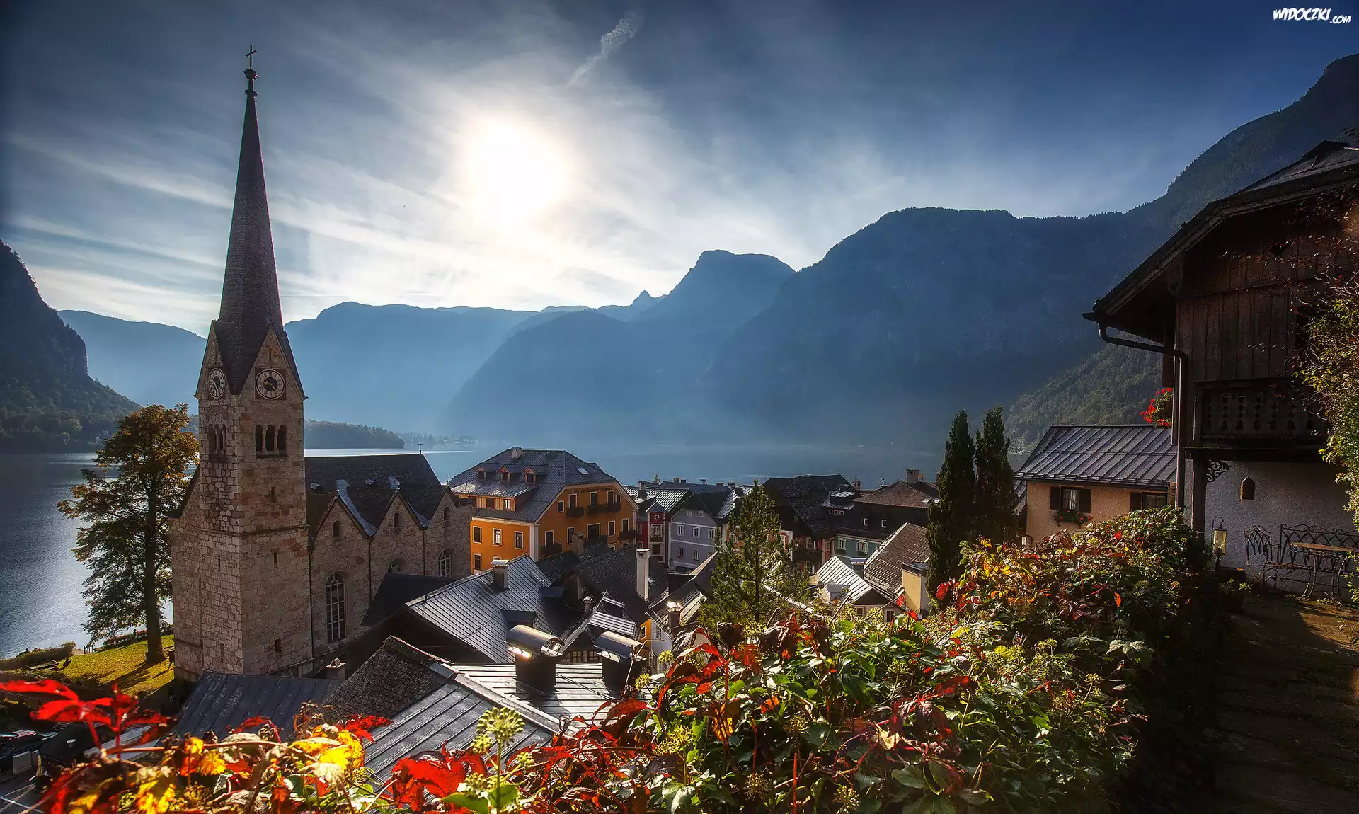 Austria, Hallstatt, Jezioro Hallstättersee, Góry, Alpy Salzburskie, Kościół pw. Wniebowzięcia Matki Bożej, Domy |