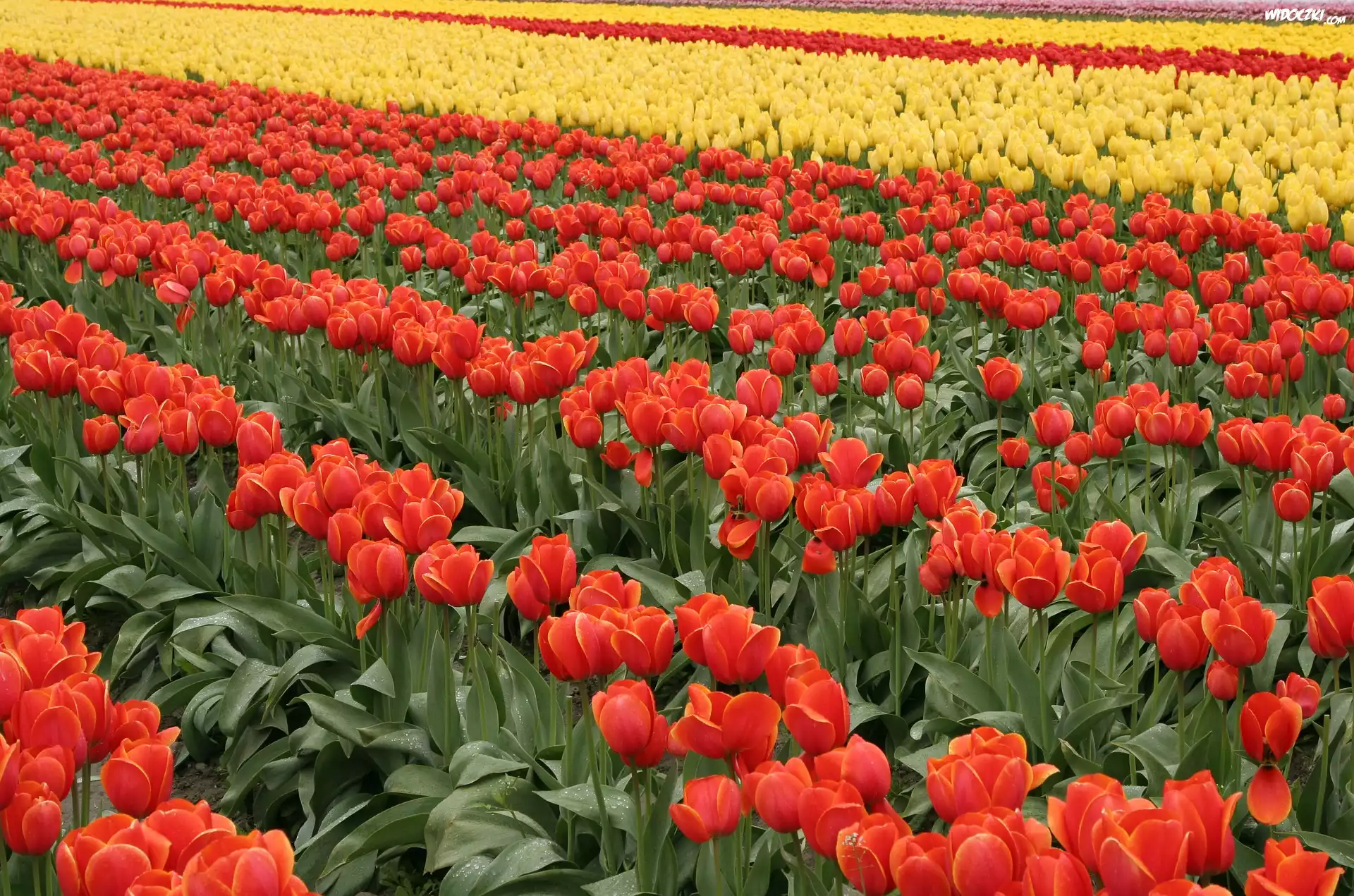 Zdjęcia, Kwiaty, Tulipany, Czerwone, Żółte, Plantacja
