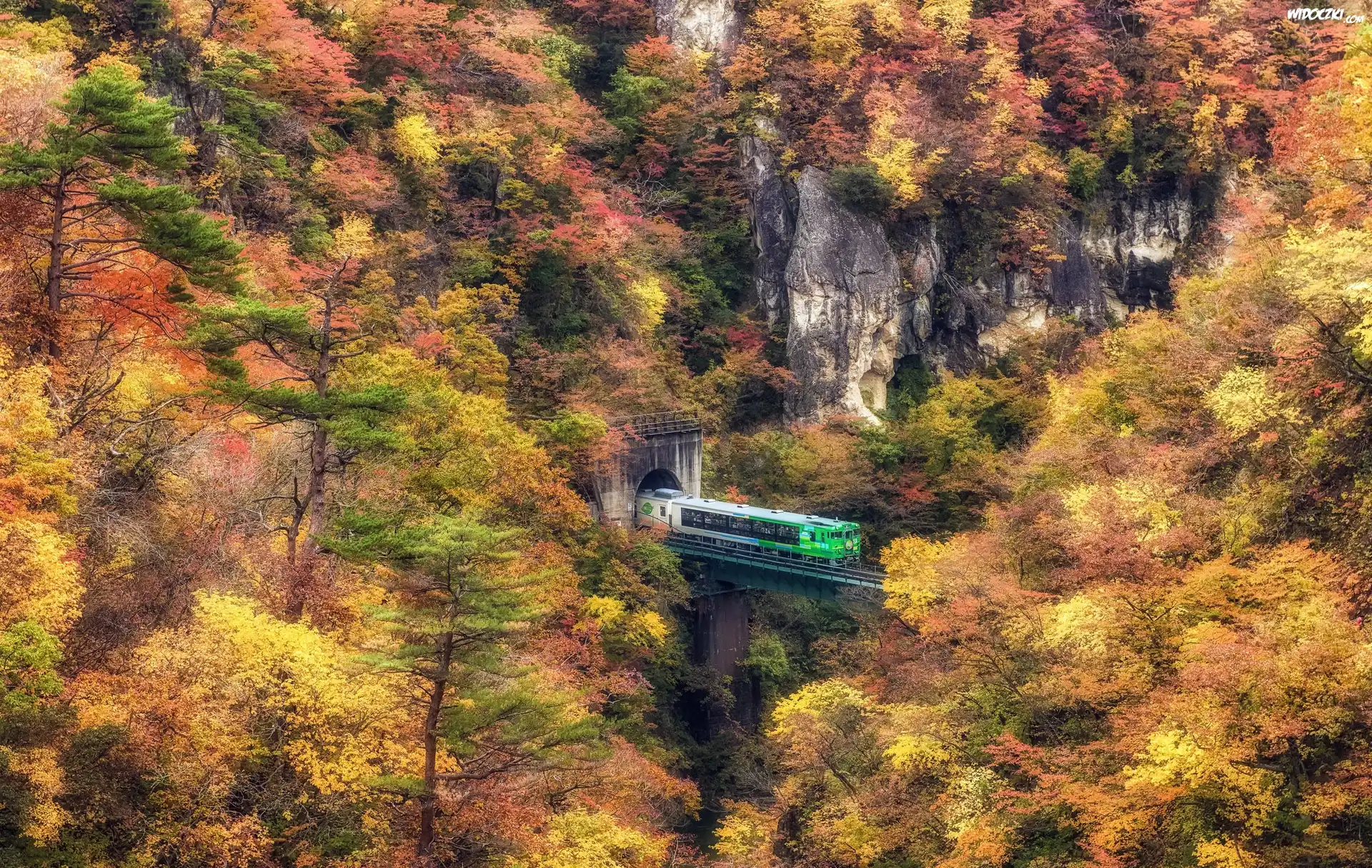 Zdjęcia, Pociąg, Tunel, Jesień, Skały, Drzewa