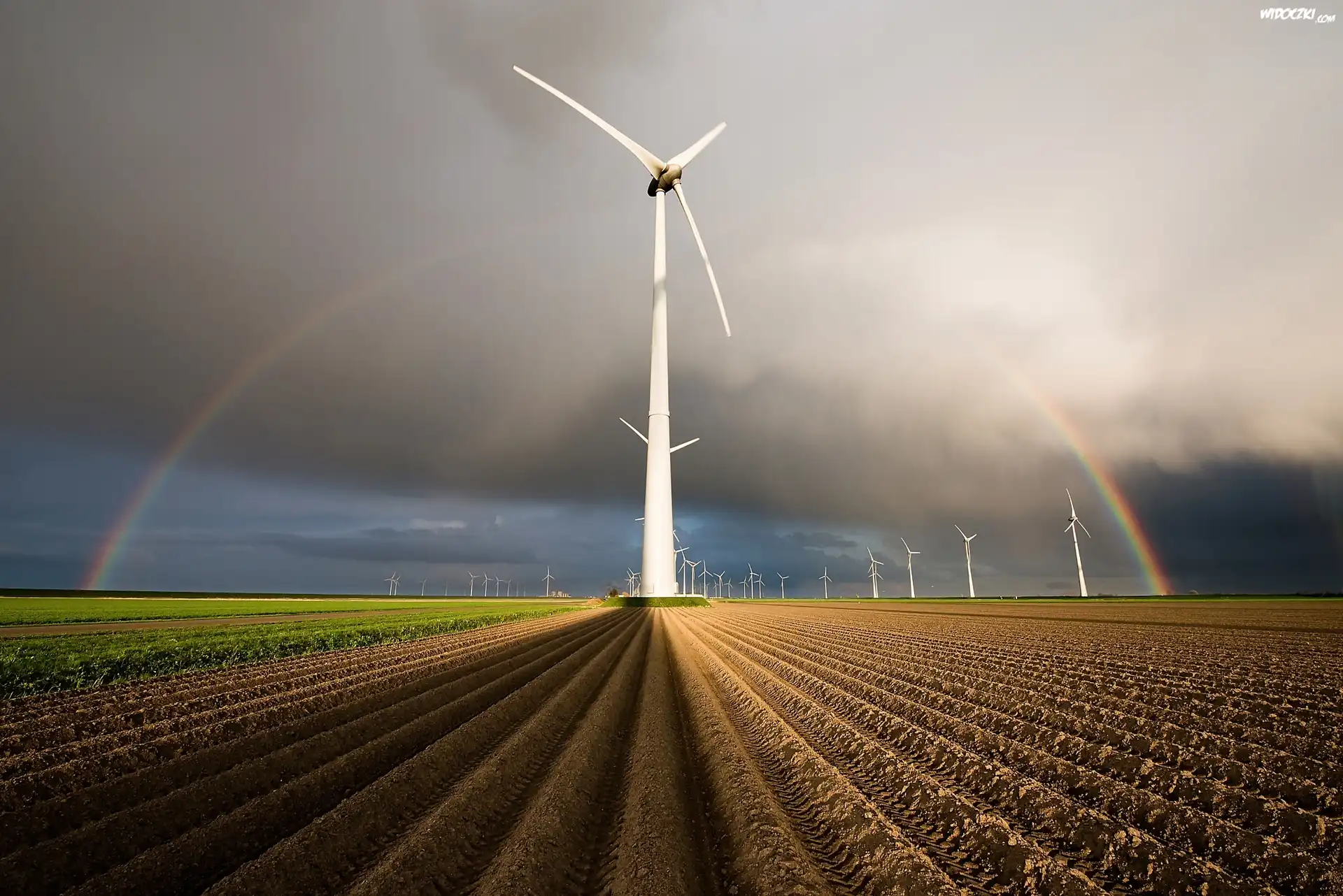 Turbiny Wiatrowe, Pole, Tęcza, Krajobraz