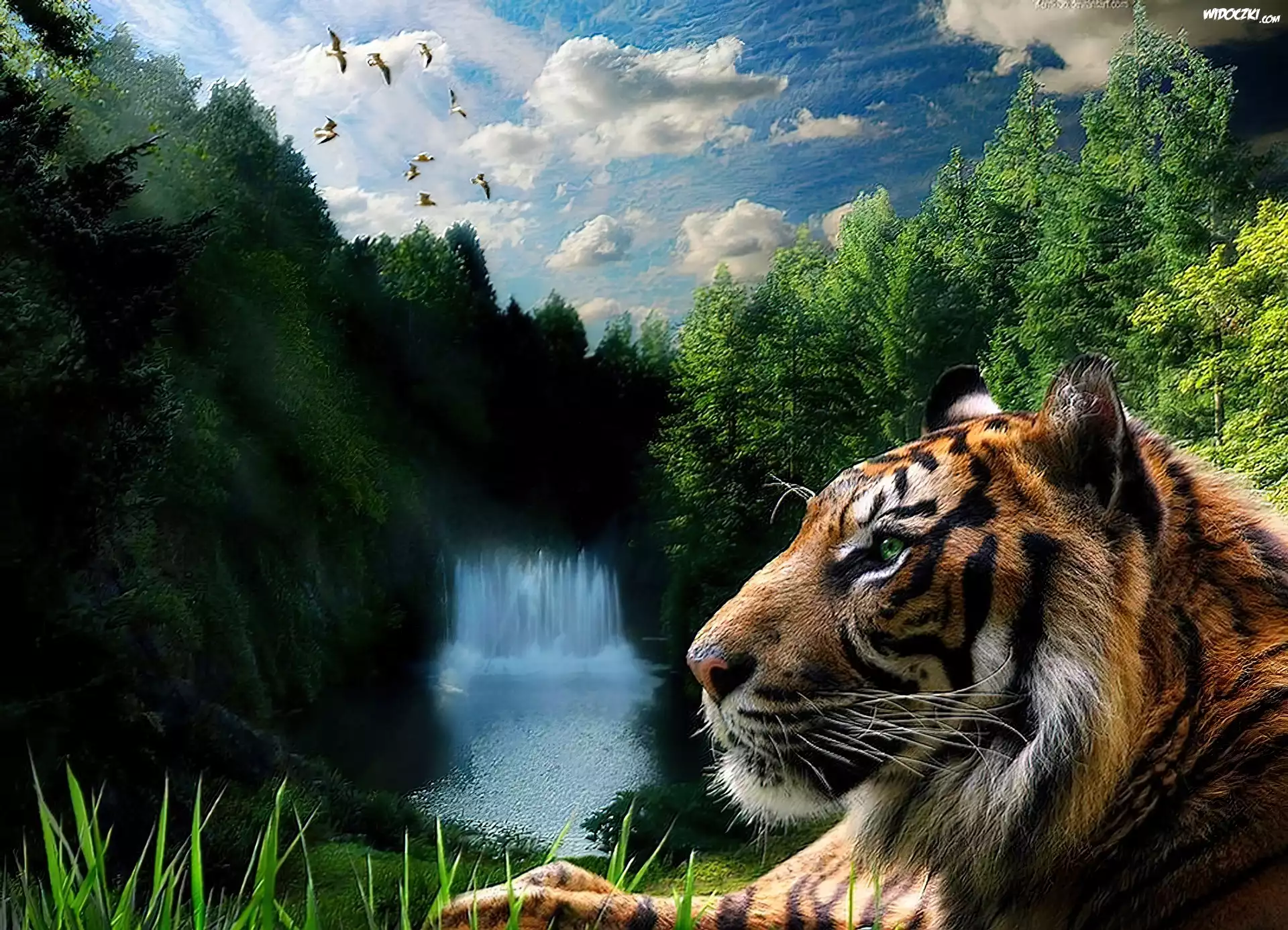 Tygrys, Las, Chmury, Łąka, Jezioro
