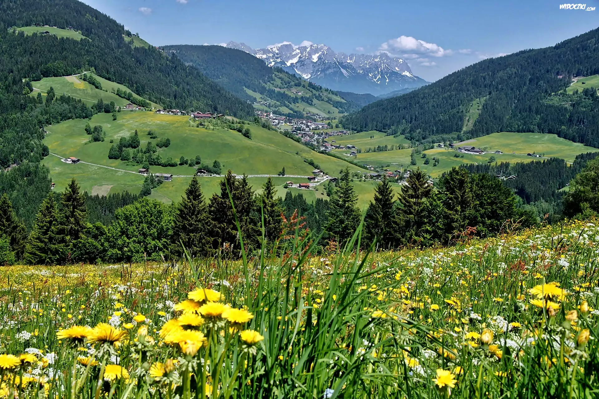 Zdjęcia, Tyrol, Dolina, Wildschoenau, Lasy, Łąka, Wioska