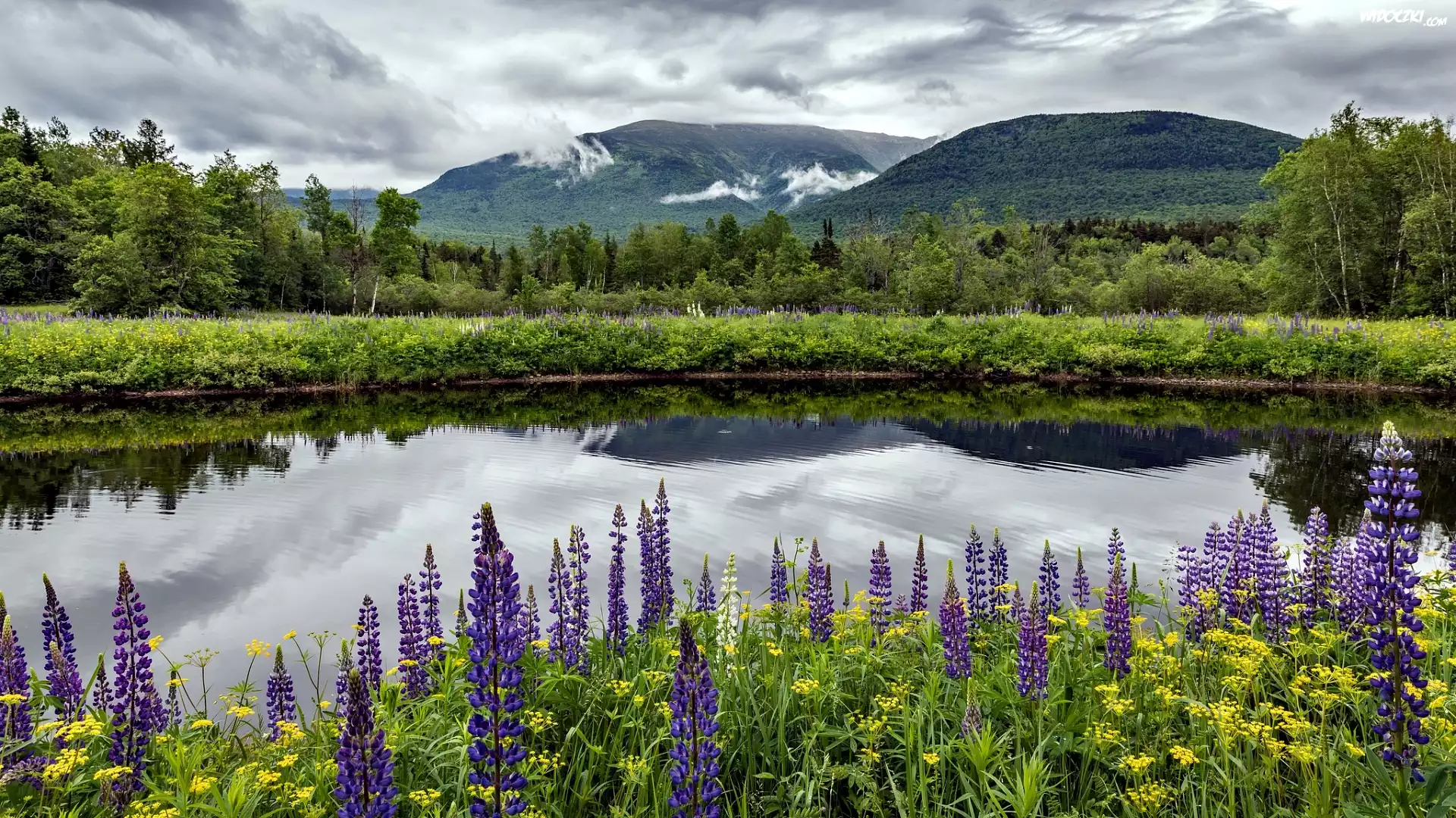 Zdjęcia, Łubin, Żółte, Kwiaty, Rzeka, Drzewa, Góry