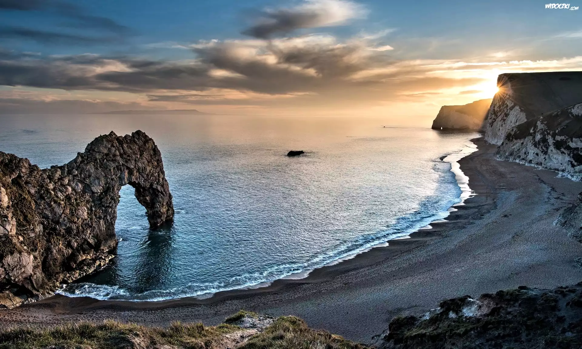 Zdjęcia, Anglia, Wybrzeże Jurajskie, Morze, Skały, Łuk wapienny, Durdle Door, Brzeg, Wschód słońca