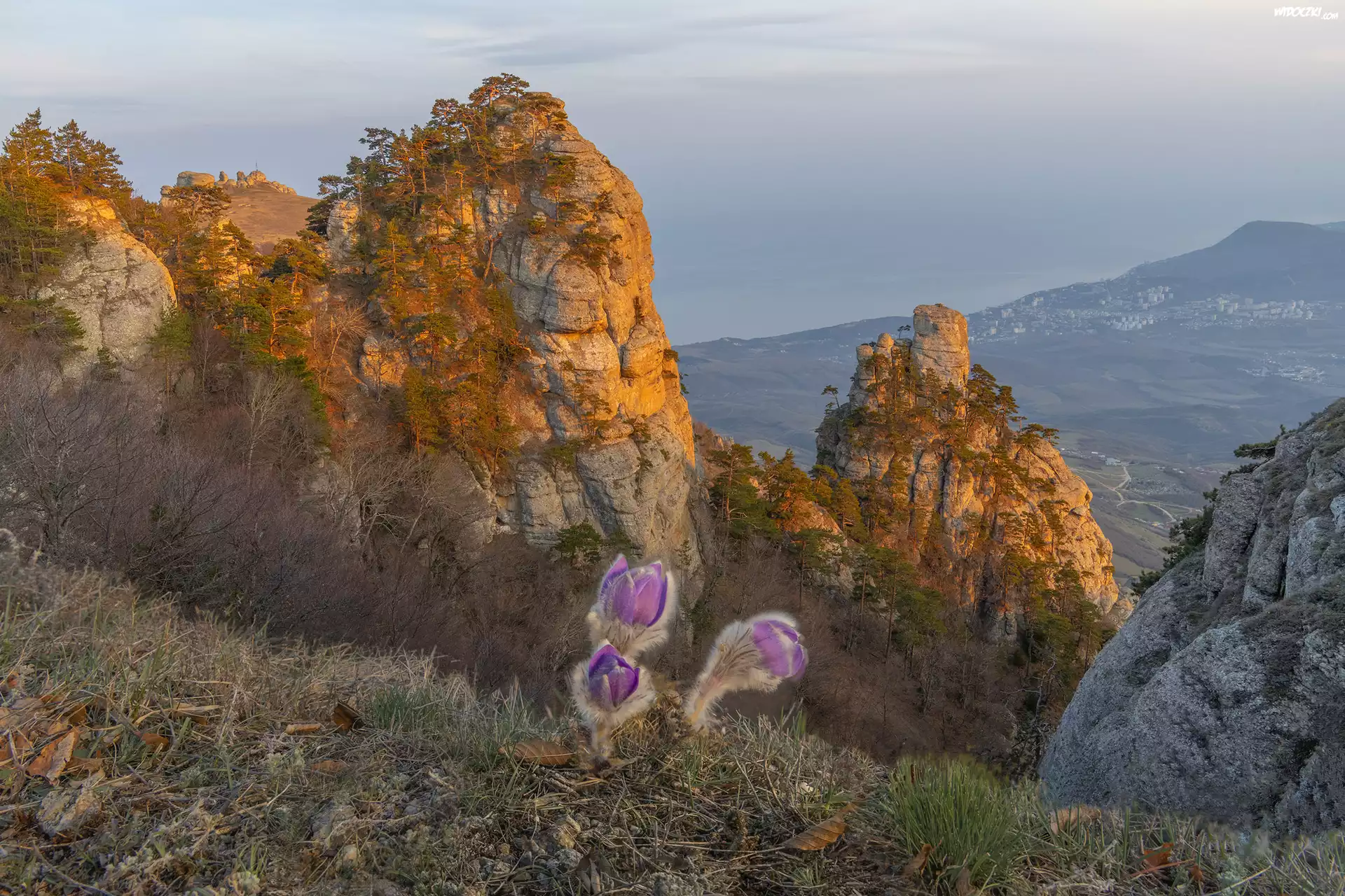 Zdjęcia, Góry Krymskie, Skały, Polana, Kwiaty, Sasanki, Masyw Demerdżi, Ukraina