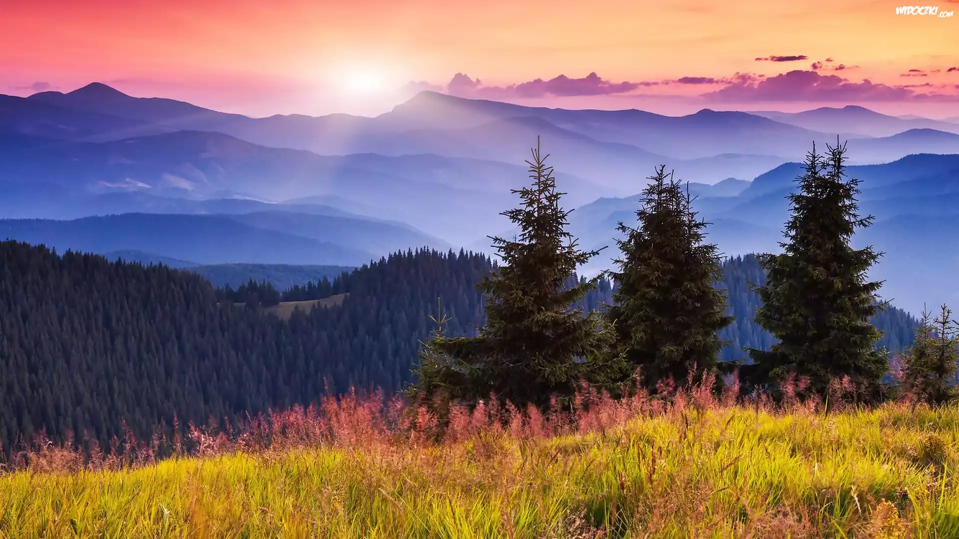 Zdjęcia, Piękny, Wschód, Słońca, Góry, Lasy, Mgła, Drzewa, Łąka, Ukraina